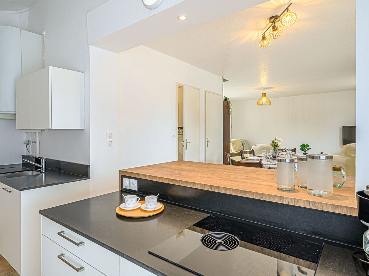 Cuisine ouverte (lave-vaisselle, 4 plaques à induction, grille-pain, bouilloire électrique, micro-ondes, cafetière électrique).