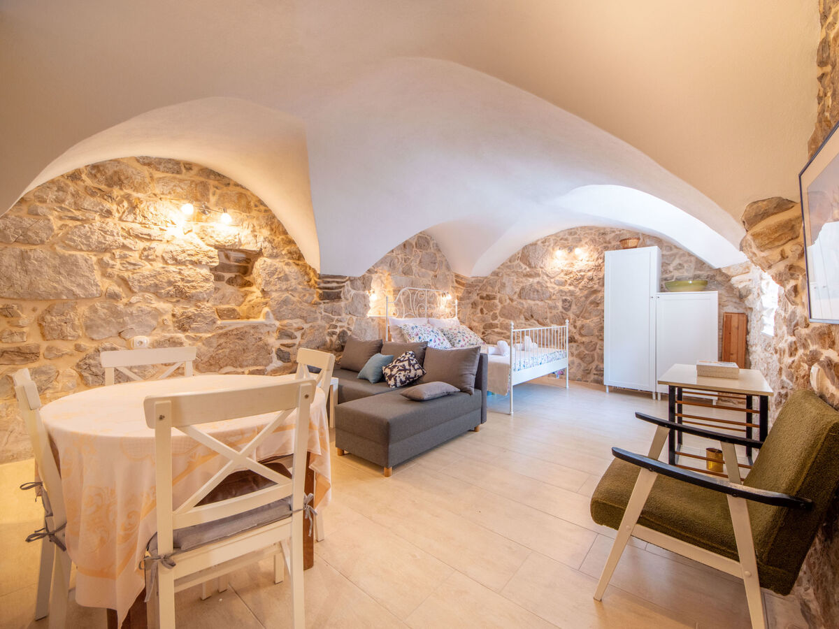 À l'étage supérieur: (escalier extérieur) séjour/salle à manger avec 1 divan-lit double (160 cm, longueur 200 cm), TV.