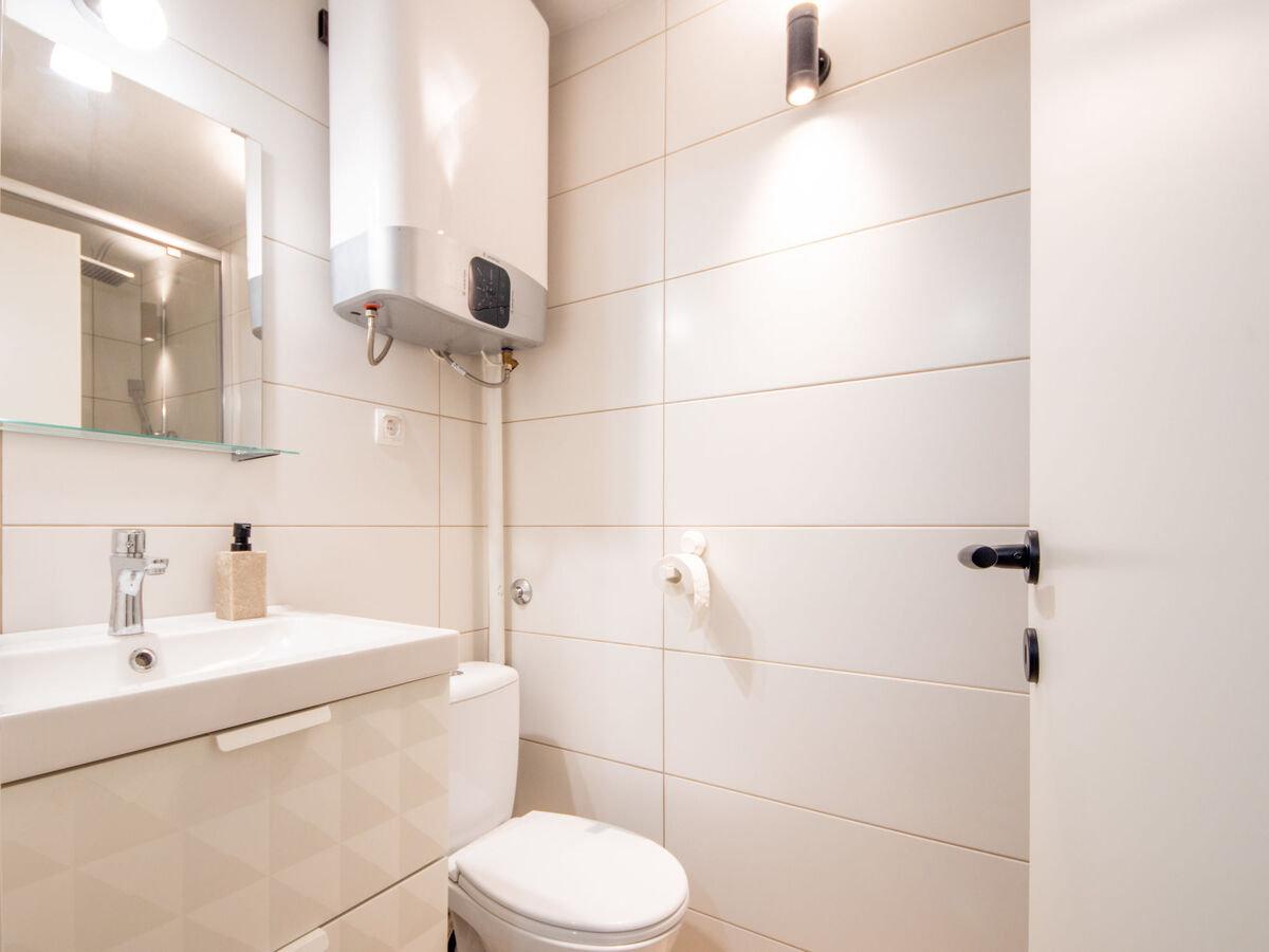 Séjour/chambre à coucher mansardé hauteur plafond 160 - 230 cm, Portes basses hauteur 154 cm avec 1 divan-lit (110 cm, longueur 210 cm), 1 grand-lit (160 cm, longueur 200 cm), coin-cuisine, douche/WC et TV.