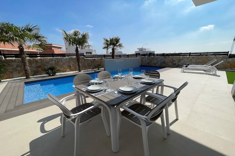 À seulement 5 minutes des plages de sable doré de Guardamar, cette élégante villa sur la Costa Blanca allie à la perfection le charme de la plage et le paradis du golf. Idéale pour les familles ou les groupes d'amis, elle dispose d'une piscine privée, d'un solarium avec douche et d'une terrasse ensoleillée, idéale pour se détendre après une journée d'aventure.