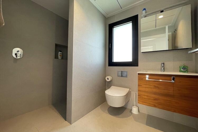 À l'intérieur, la villa est soigneusement aménagée pour votre confort. Le rez-de-chaussée comprend des chambres confortables, des salles de bains modernes et un lumineux séjour/salle à manger avec cuisine ouverte et rangements. De grandes fenêtres offrent une vue sur la piscine, créant une ambiance intérieure et extérieure harmonieuse. La climatisation et un parking privé ajoutent au confort.