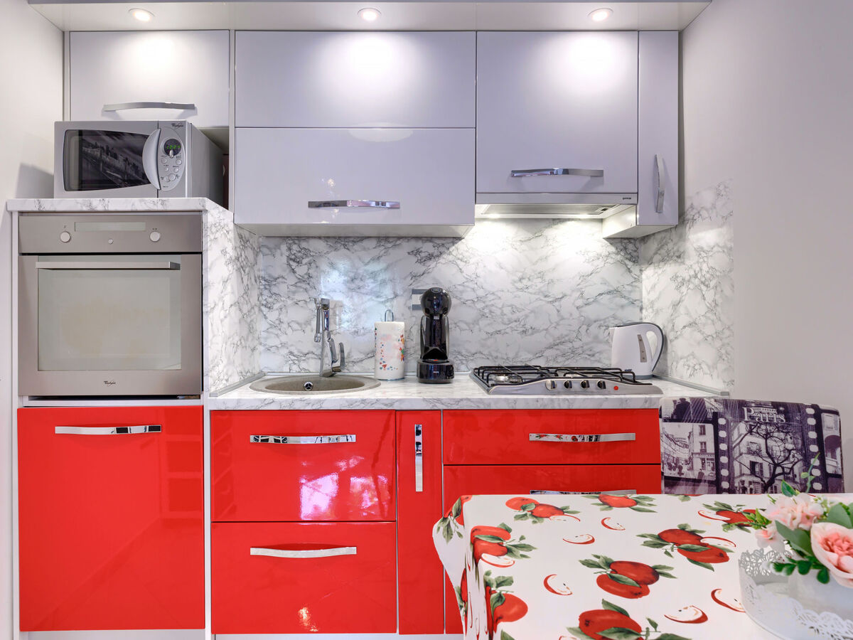 Cuisine ouverte (3 plaques de cuisson, four, lave-vaisselle, 1 plaque vitrocéramiques, bouilloire électrique, congélateur, cafetière électrique).