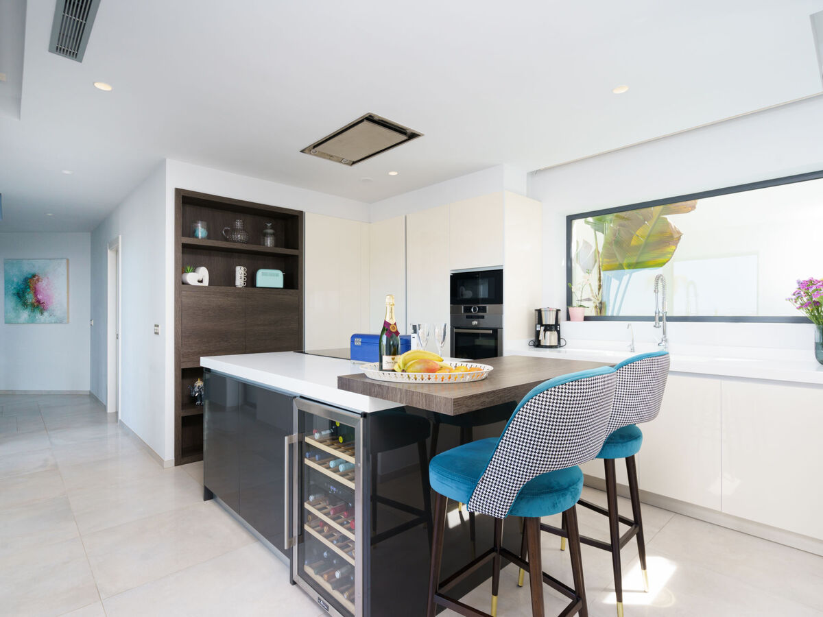 Grande cuisine ouverte (four, lave-vaisselle, 5 plaques à induction, grille-pain, micro-ondes, congélateur, cafetière électrique, ilot de cuisine).