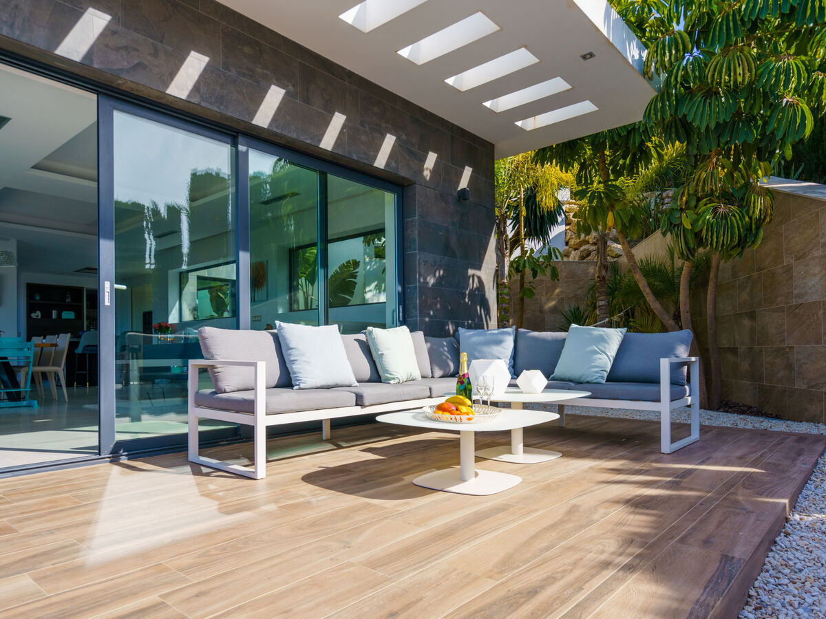 Douche extérieure, pergola, terrasse, meubles de jardin, barbecue.