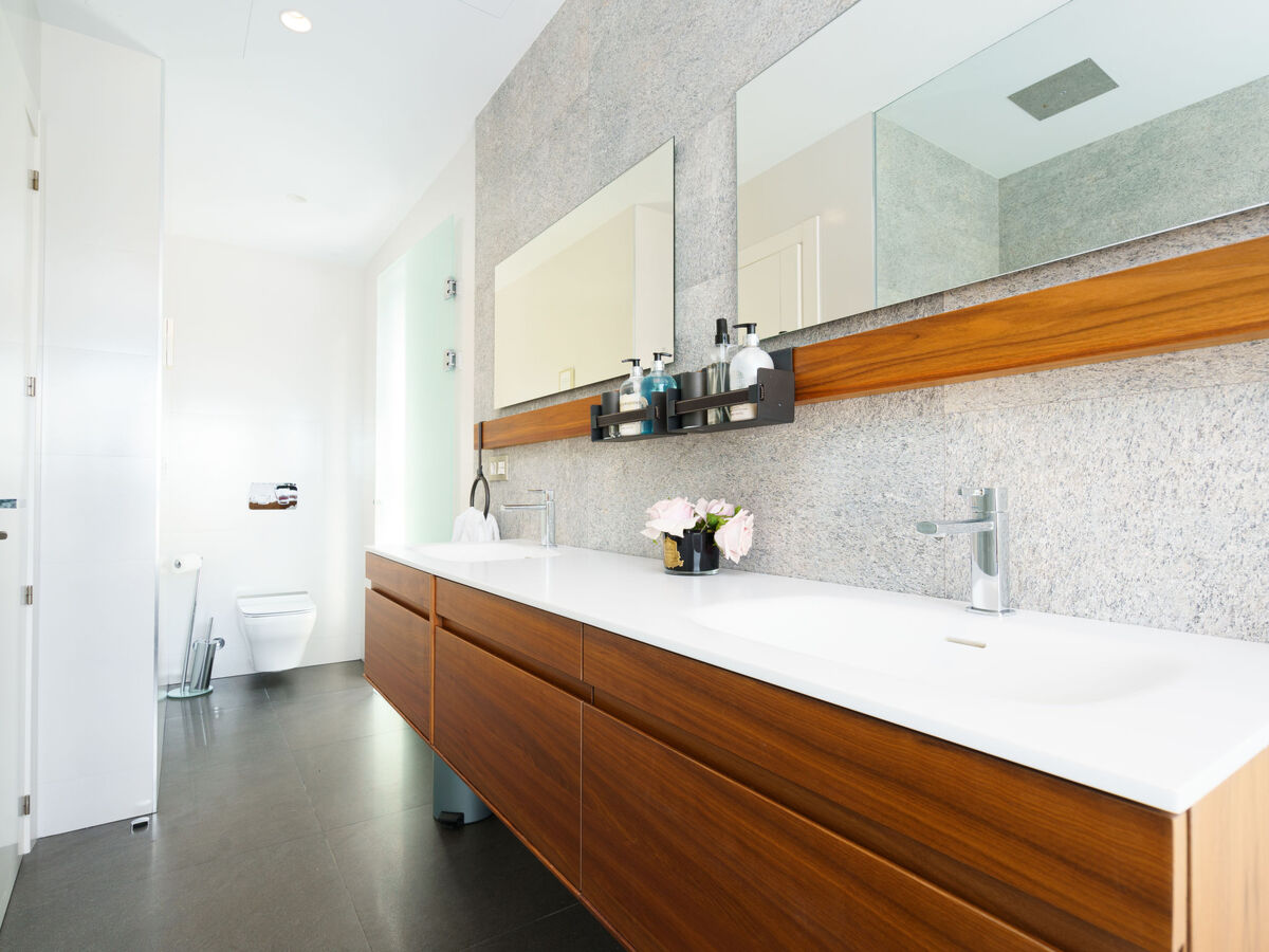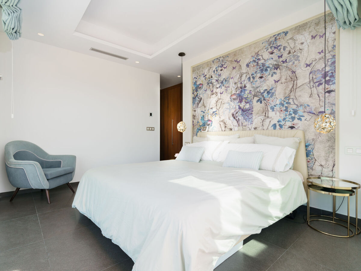 À l'étage supérieur: 1 chambre avec Dressing avec 1 grand-lit (180 cm, longueur 200 cm), bain/douche/WC, double vasque, air-conditionné et chauffage à air chaud.