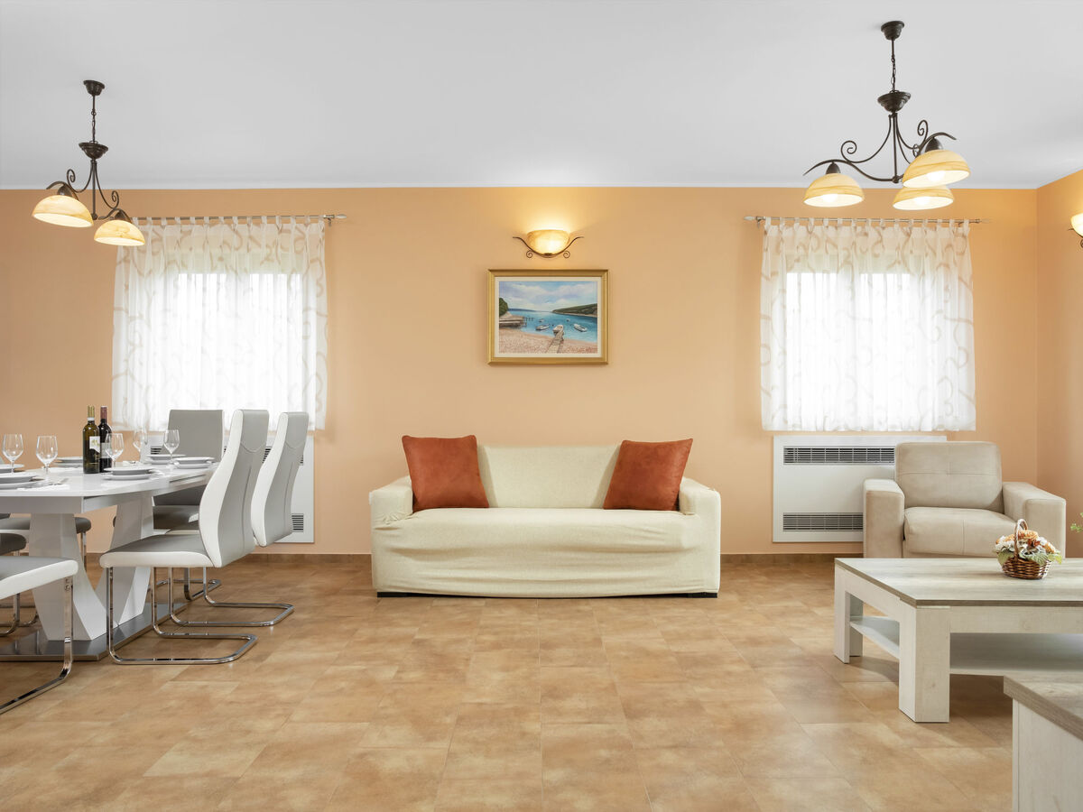 Séjour/salle à manger avec 1 divan-lit double, TV (satellite) et air-conditionné.
