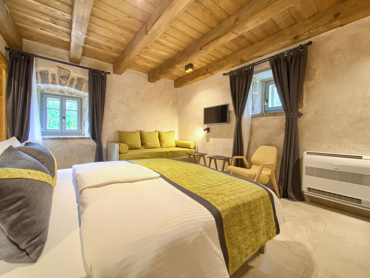 1 chambre avec 1 lit (80 cm, longueur 190 cm), 1 lit double (2 x 80 cm, longueur 200 cm), douche/WC et TV (satellite).