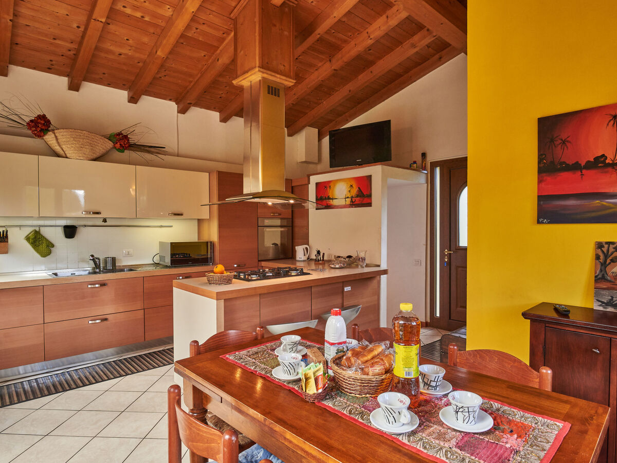 À l'étage supérieur: cuisine ouverte (four, Poêle à gaz, 5 feux, grille-pain, bouilloire électrique, micro-ondes, congélateur) avec table pour les repas et TV (écran plat).