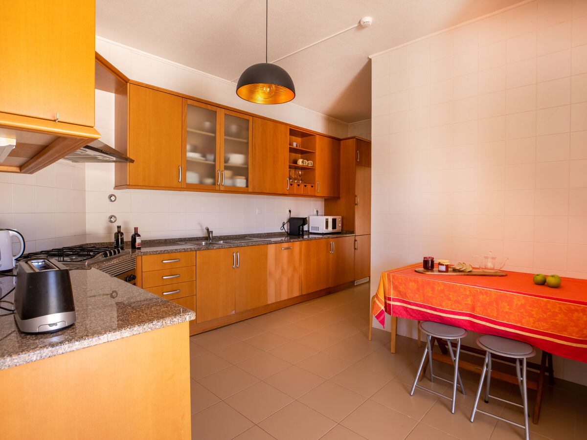 Cuisine (four, lave-vaisselle, 4 feux, grille-pain, bouilloire électrique, micro-ondes, cafetière électrique) avec petite table pour les repas.