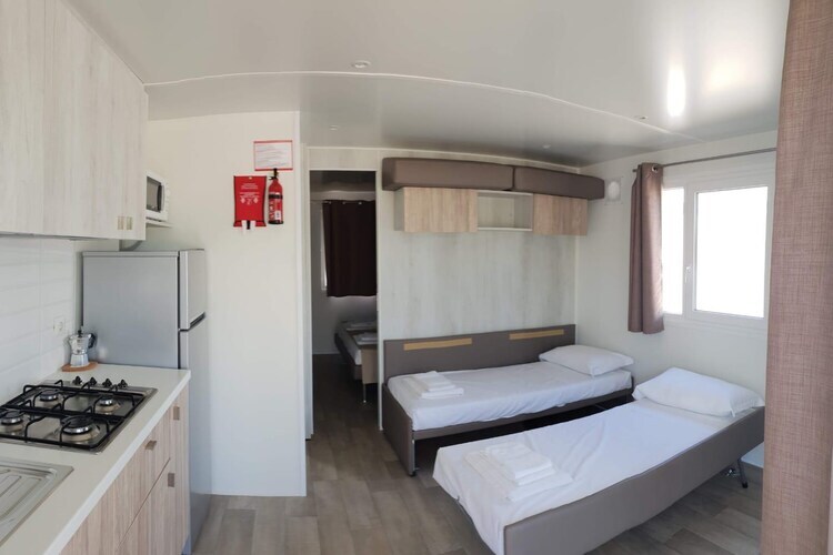 Salle de séjour(Canapé-lit simple, Lit rabattable simple, TV(satellite)), coin cuisine(foyer(4 foyers, vitrocéramique), micro ondes, combinaison réfrigérateur/congélateur), chambre(lit simple, lit double), salle de bains(douche, WC, sèche-cheveux), Barbecue central, Reception, Parking, Football de table, Location de vélos, Tennis de table, Terrain de football, Snackbar, Aire de jeux, sèche-linge(partagé avec d'autres clients, payant), lave-linge (partagé avec d'autres clients, payant), patio, chauffage, climatisation, jardin, mobilier de jardin, transats, parasol, piscine(partagé avec d'autres clients, extérieur, ouvert de Mai jusqu'à (inclus) 1/2 Oct), terrain de pétanque(partagé avec d'autres clients), Poste de charge pour les voitures électriques