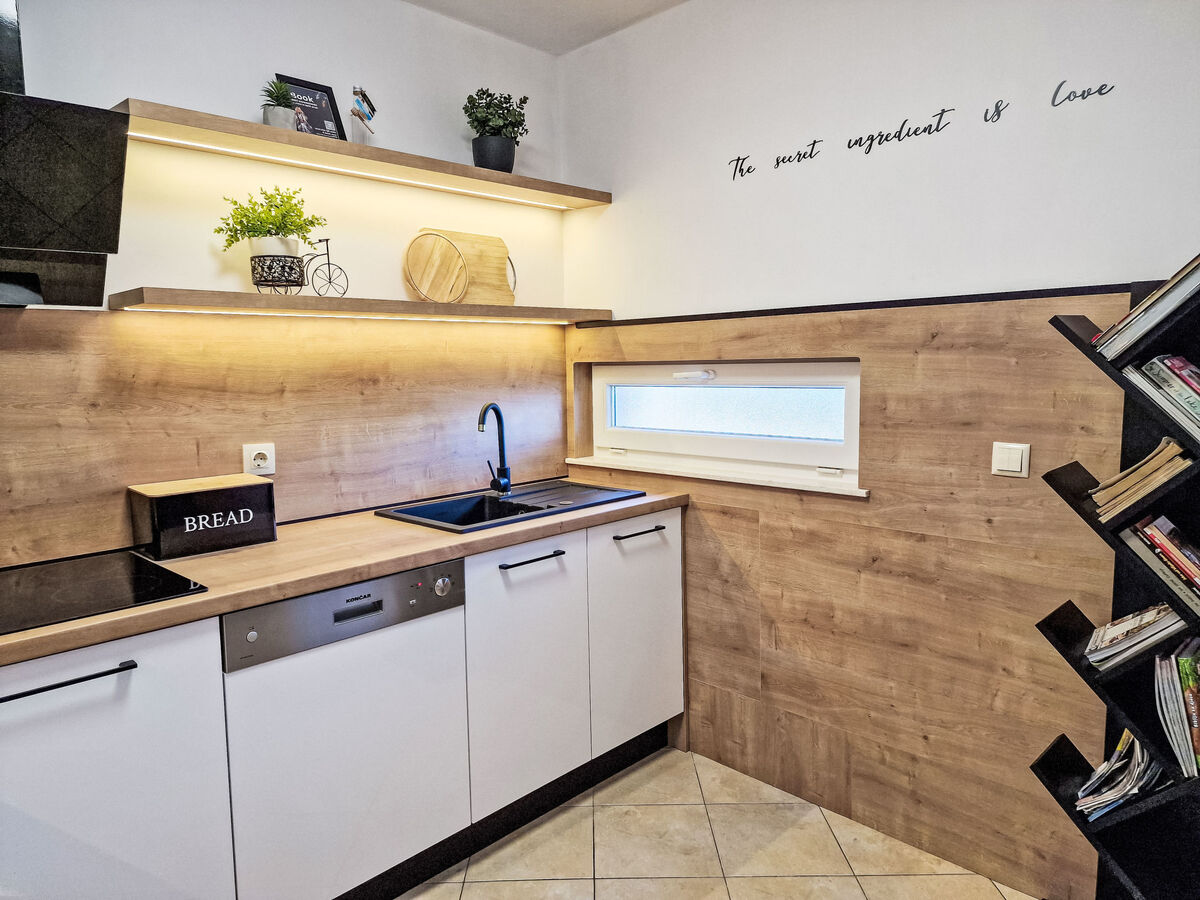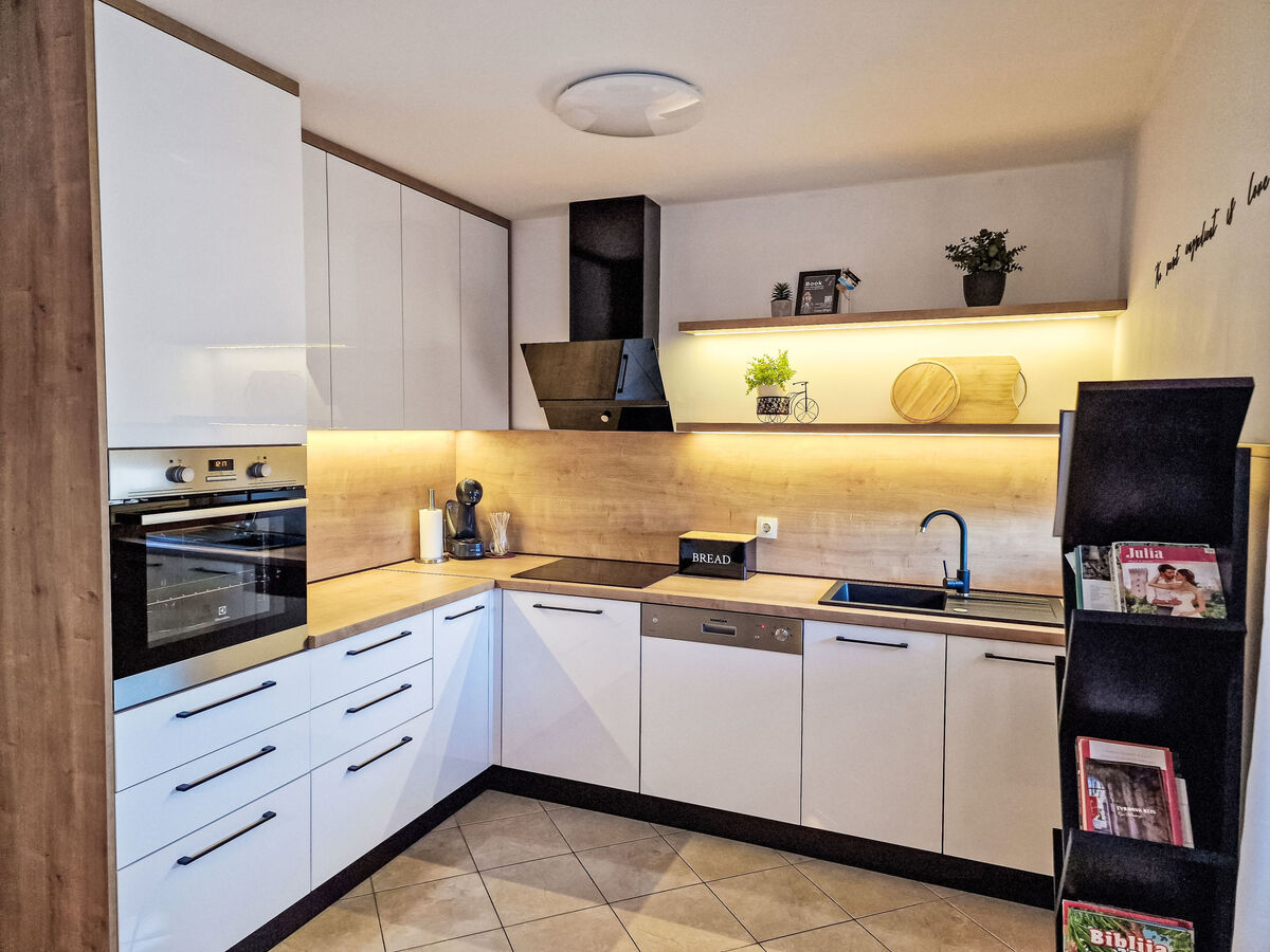 Cuisine ouverte (four, lave-vaisselle, 4 plaques vitrocéramiques, congélateur, cafetière électrique).