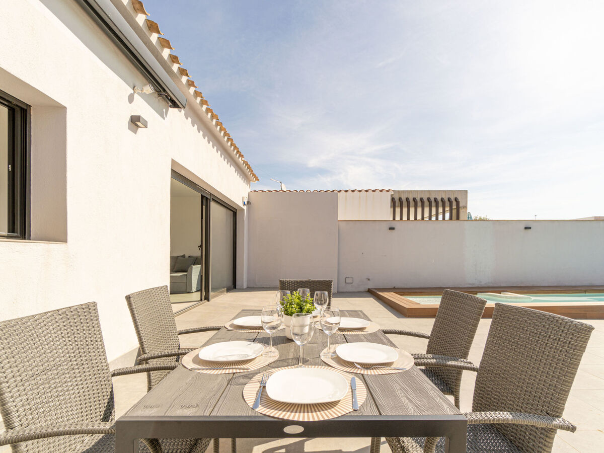 Sortie sur la terrasse, sur la piscine, orientée sud.