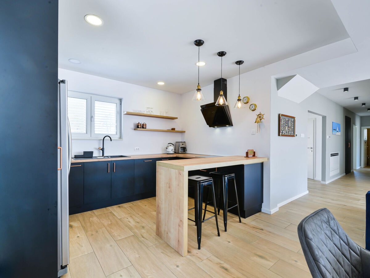 Cuisine ouverte (four, lave-vaisselle, 4 plaques vitrocéramiques, bouilloire électrique, micro-ondes, congélateur, cafetière électrique).