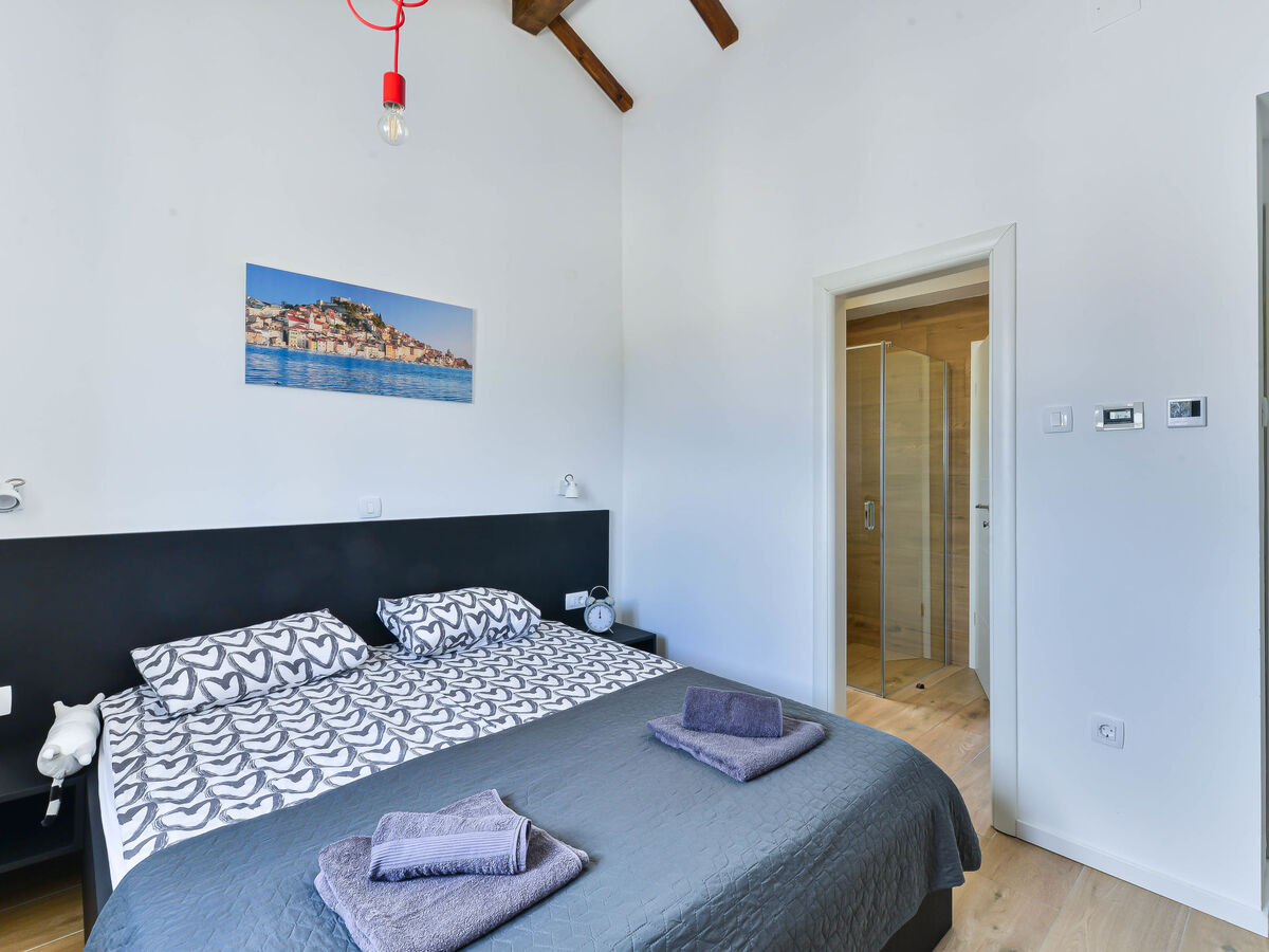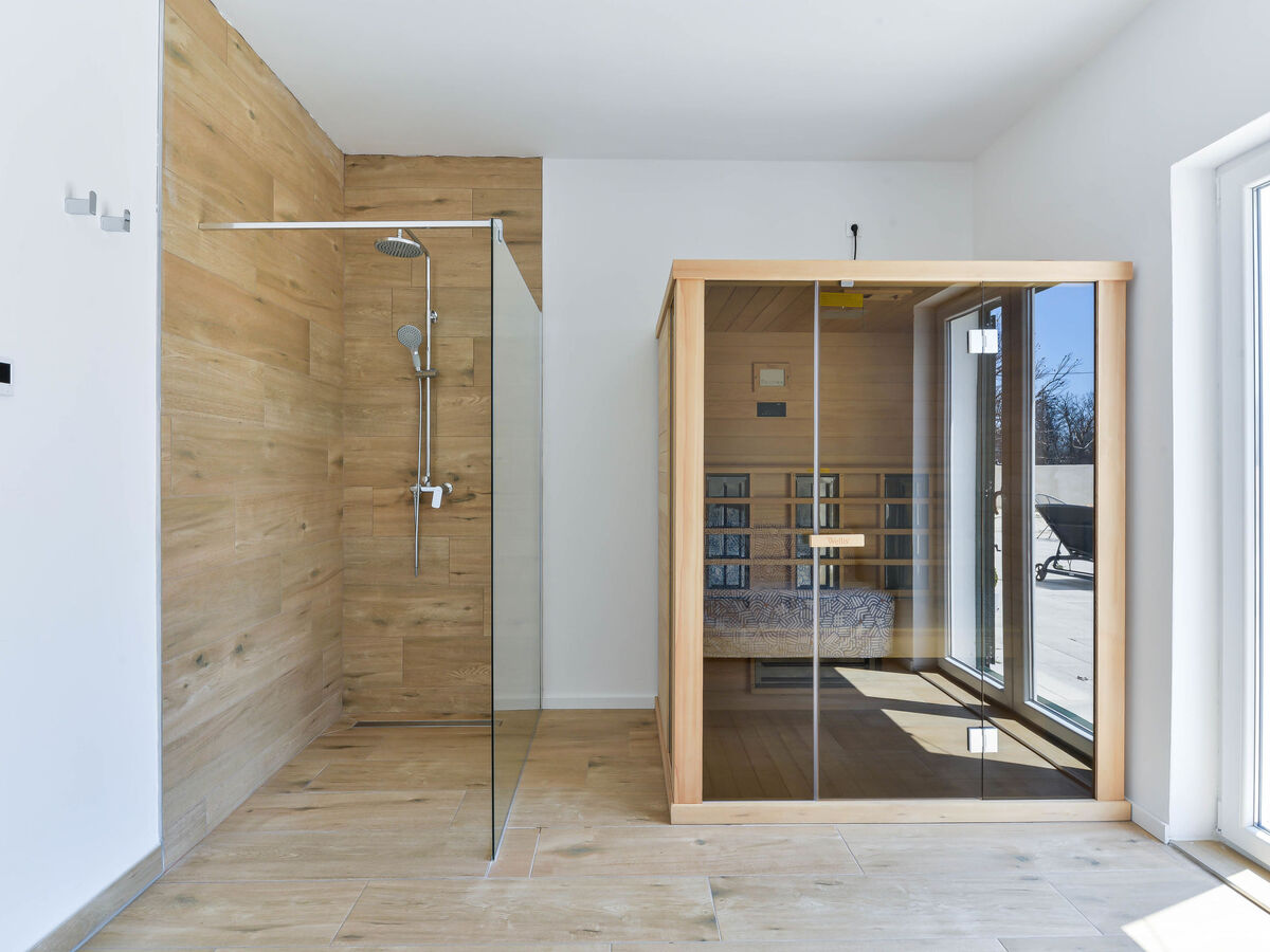 1 chambre avec 1 divan-lit double (140 cm, longueur 200 cm), douche.