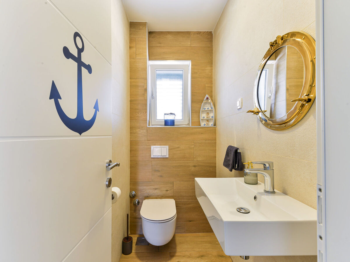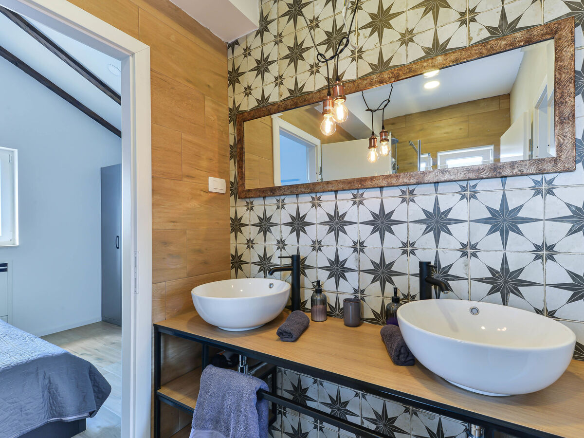 À l'étage supérieur: 1 chambre avec 1 grand-lit (160 cm, longueur 200 cm), douche/WC et TV (satellite) (écran plat), air-conditionné.