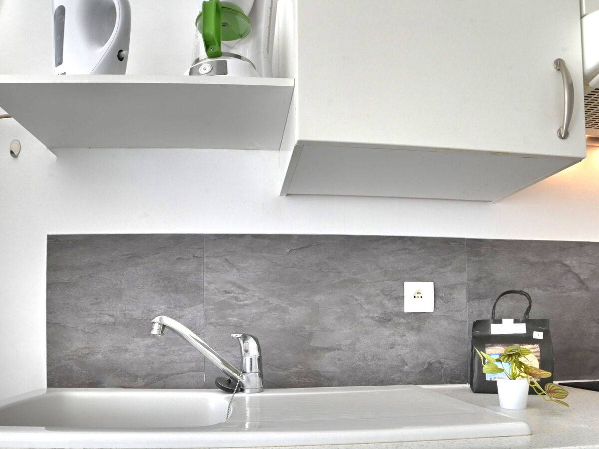 Cuisine ouverte (2 plaques vitrocéramiques, grille-pain, bouilloire électrique, micro-ondes, congélateur, cafetière électrique) avec table pour les repas.