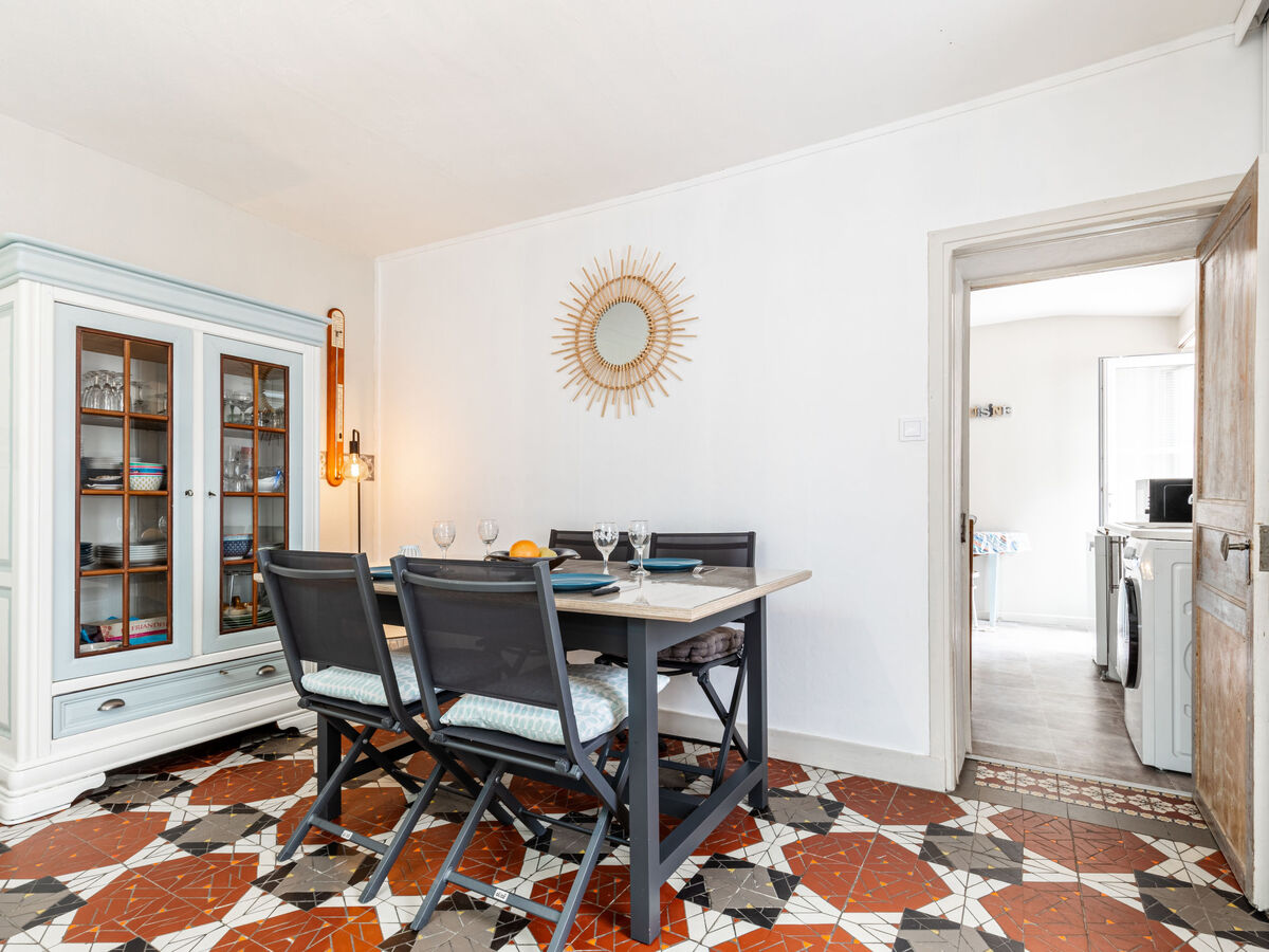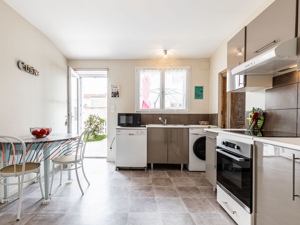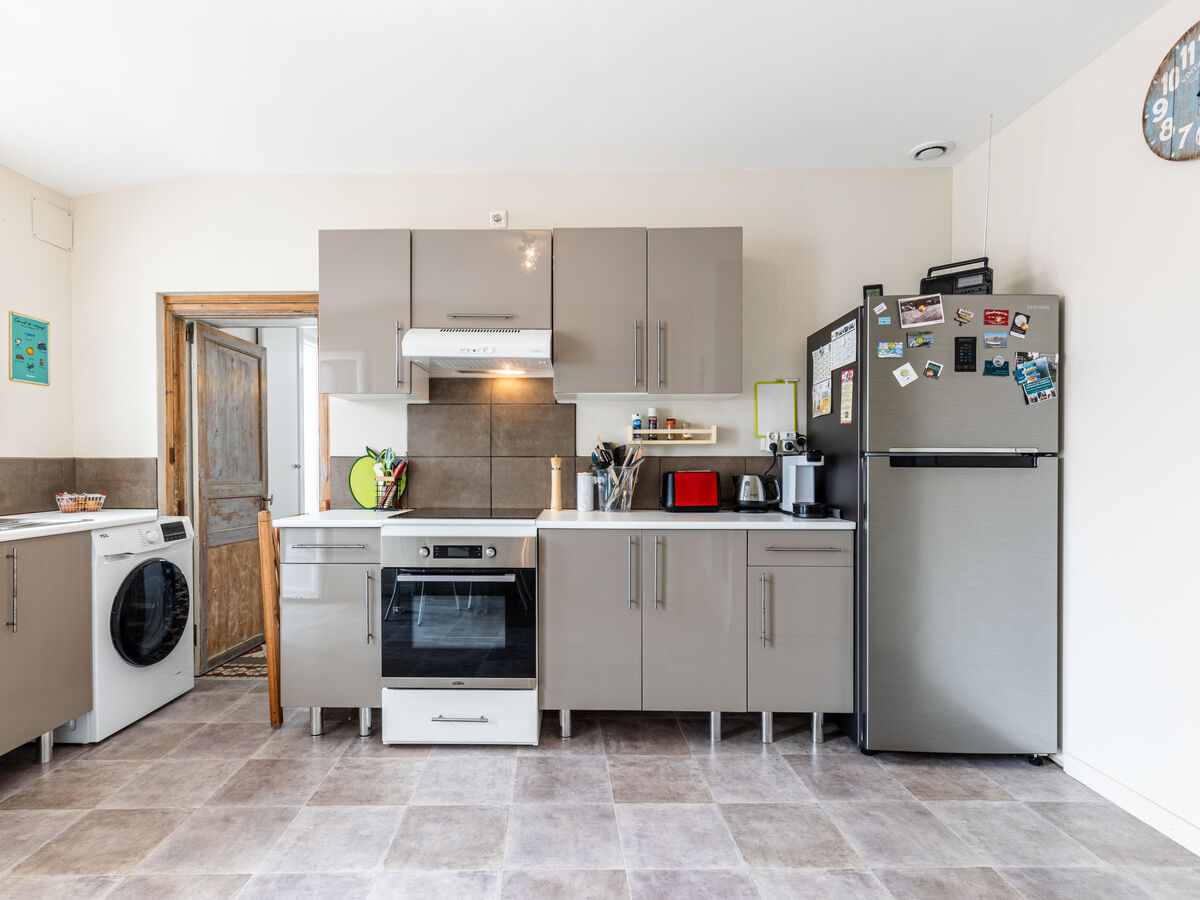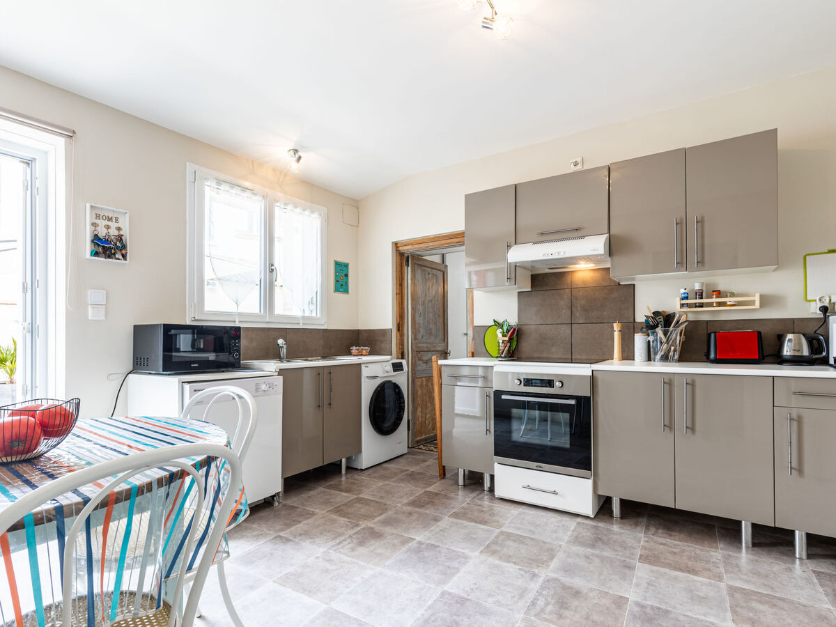 Cuisine (four, lave-vaisselle, 3 plaques à induction, grille-pain, bouilloire électrique, micro-ondes, congélateur, cafetière électrique, Capsules pour machine à café (Senséo) (NON INCLUSES)) avec table pour les repas.