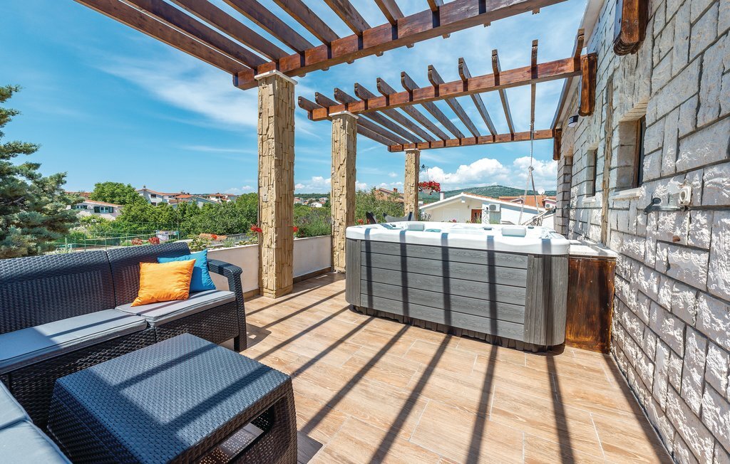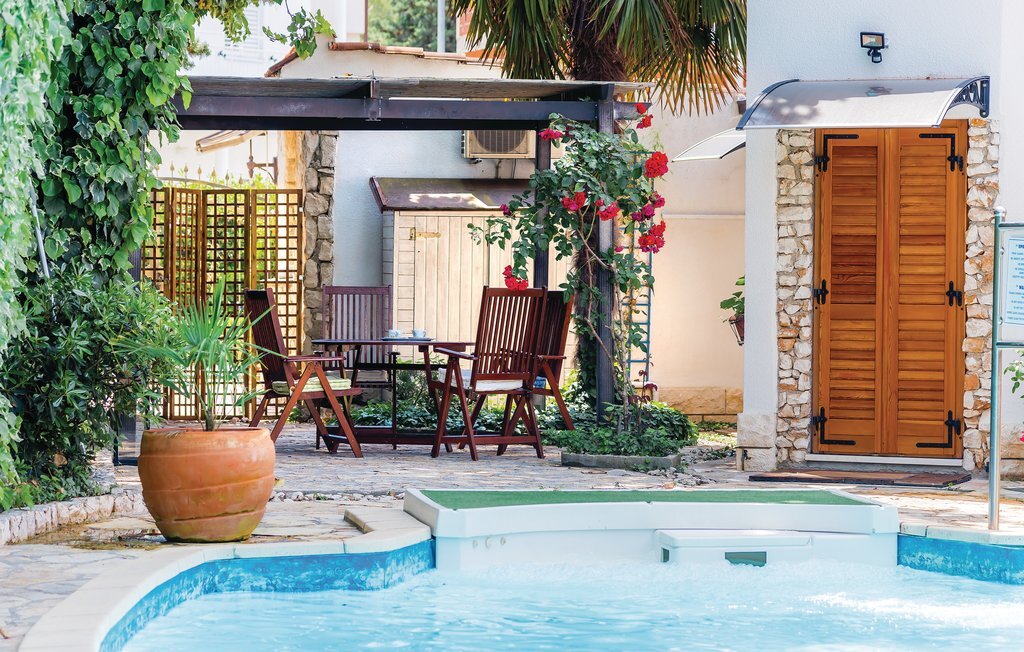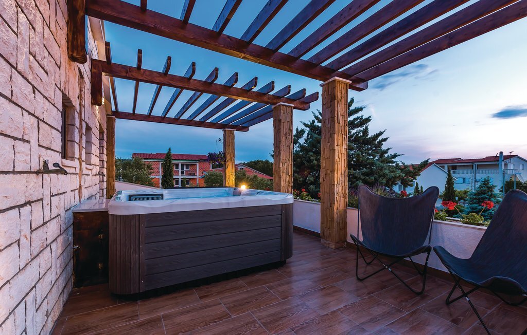 Bien-être à l'extérieur : Location de vacances disposant de chaises-longues et d'un ou plusieurs équipements tels que piscine extérieure, jacuzzi extérieur, lit à baldaquin de jardin etc...