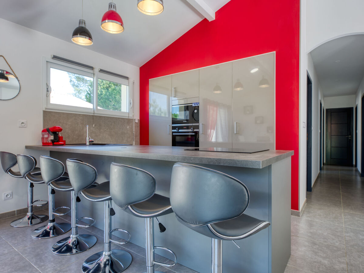 Cuisine ouverte (four, lave-vaisselle, 3 plaques à induction, grille-pain, bouilloire électrique, micro-ondes, congélateur, cafetière électrique) avec bar.