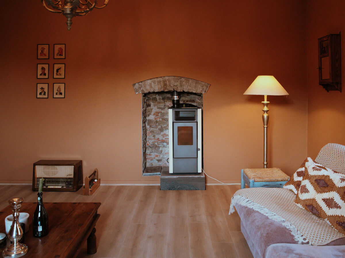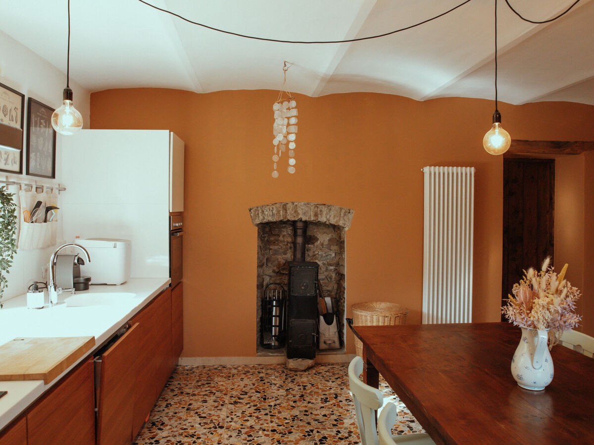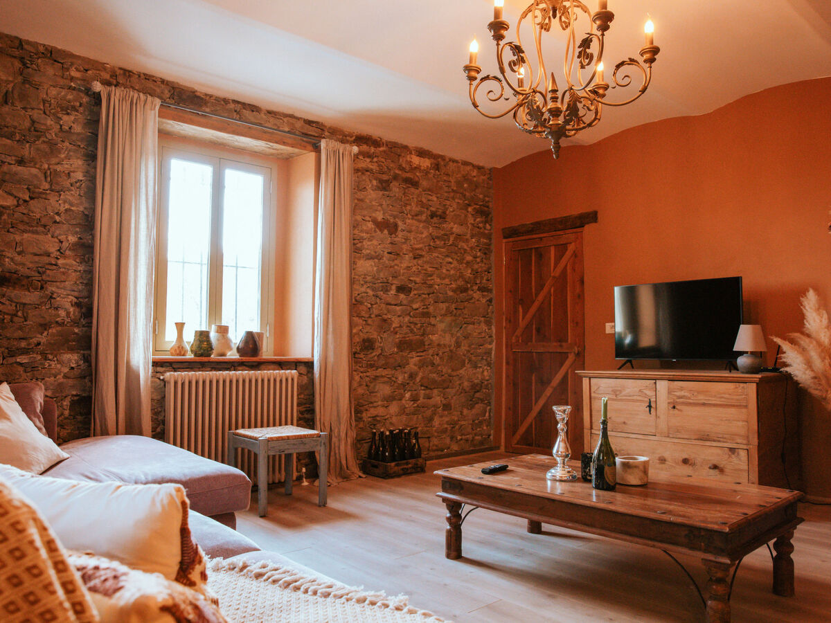 Clair, rénovée en 2023, aménagement de bon goût et de style: séjour/salle à manger avec cheminée.