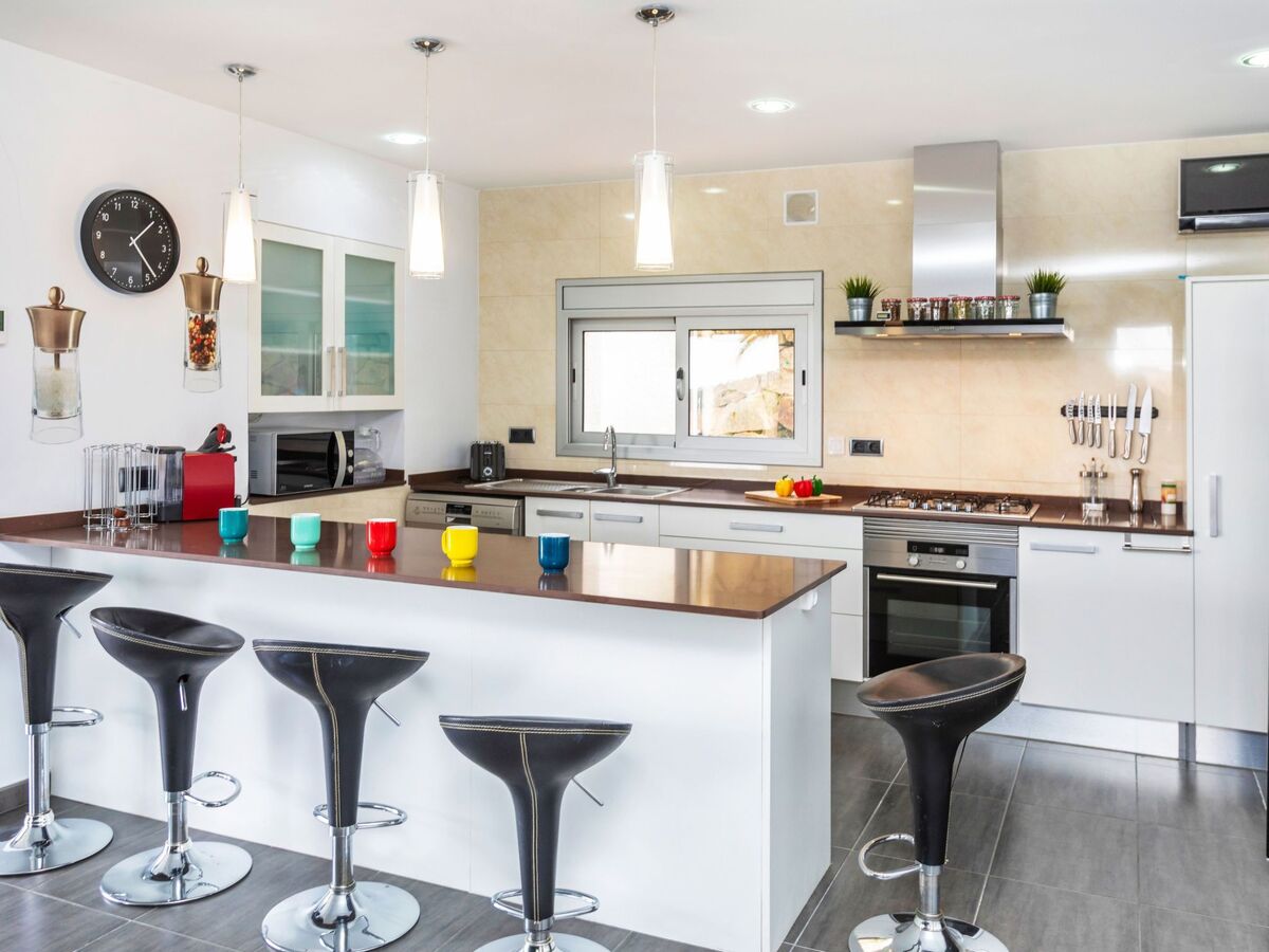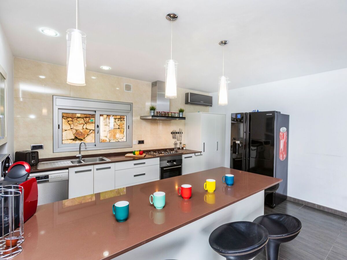 Grande cuisine ouverte (four, lave-vaisselle, 4 plaques vitrocéramiques, grille-pain, bouilloire électrique, micro-ondes, congélateur, cafetière électrique) avec bar.