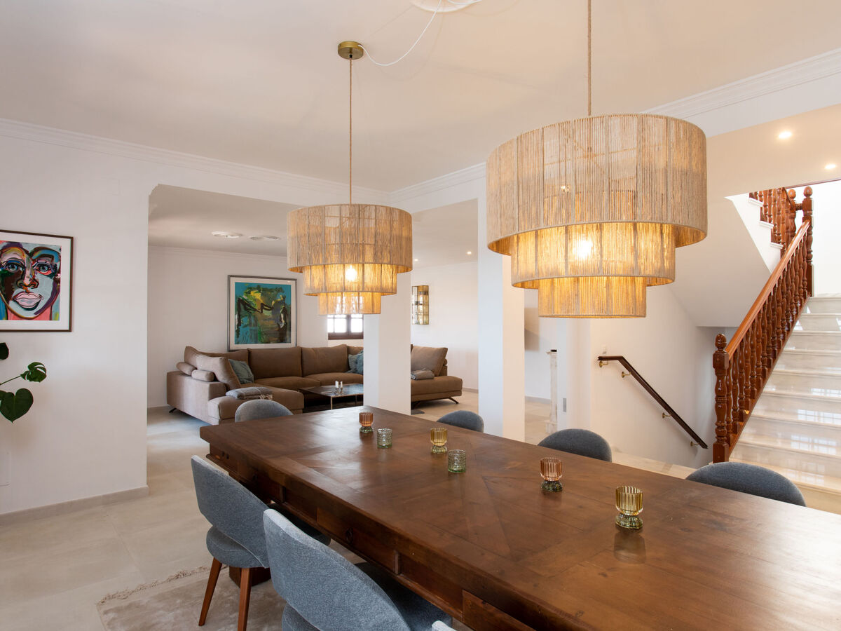 À l'étage inférieur: séjour avec cheminée, table pour les repas et bar.