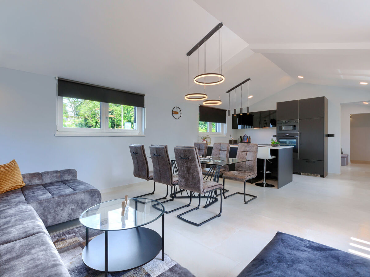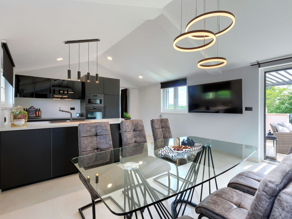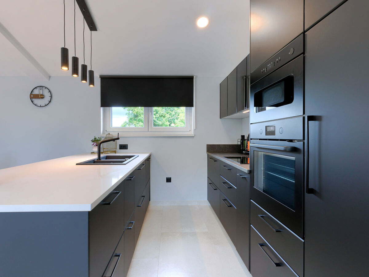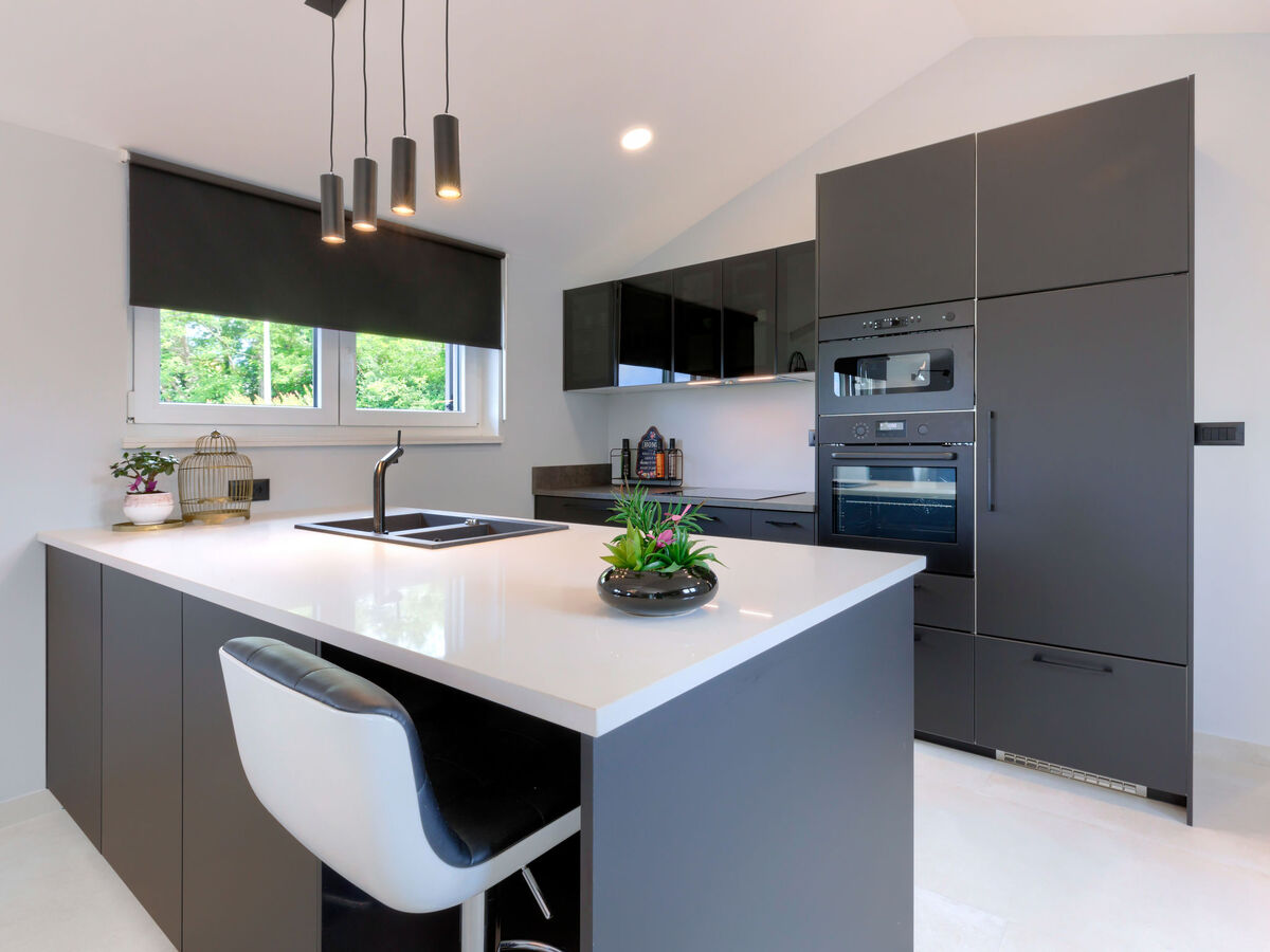 Cuisine ouverte (four, lave-vaisselle, 4 plaques à induction, grille-pain, bouilloire électrique, micro-ondes, cafetière électrique).