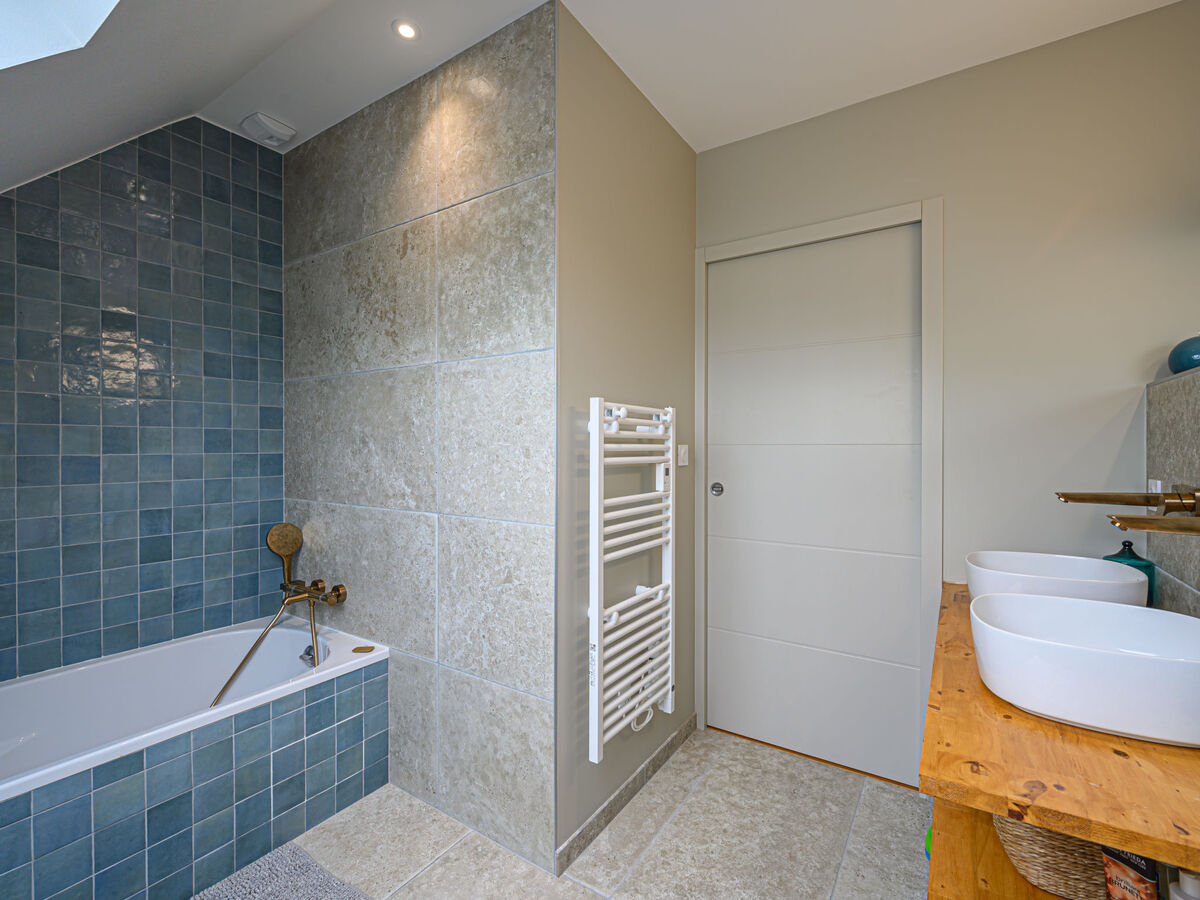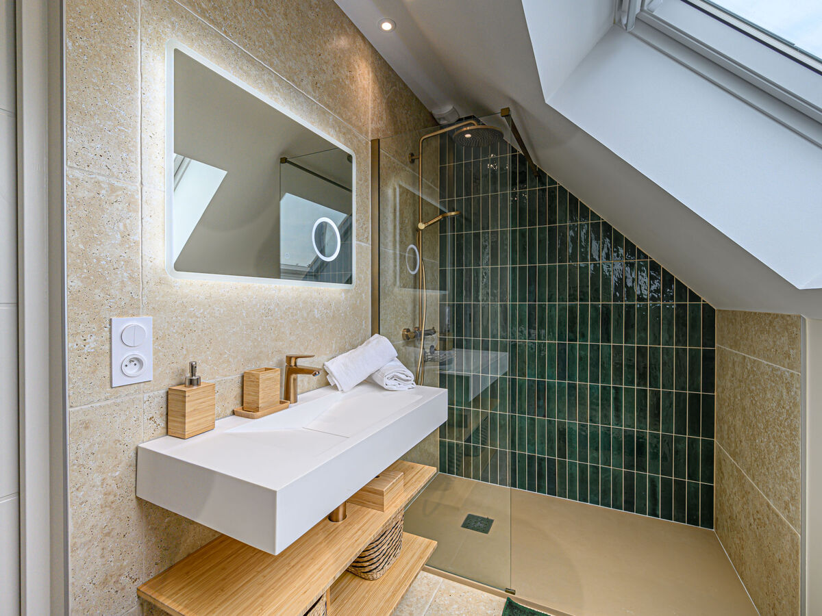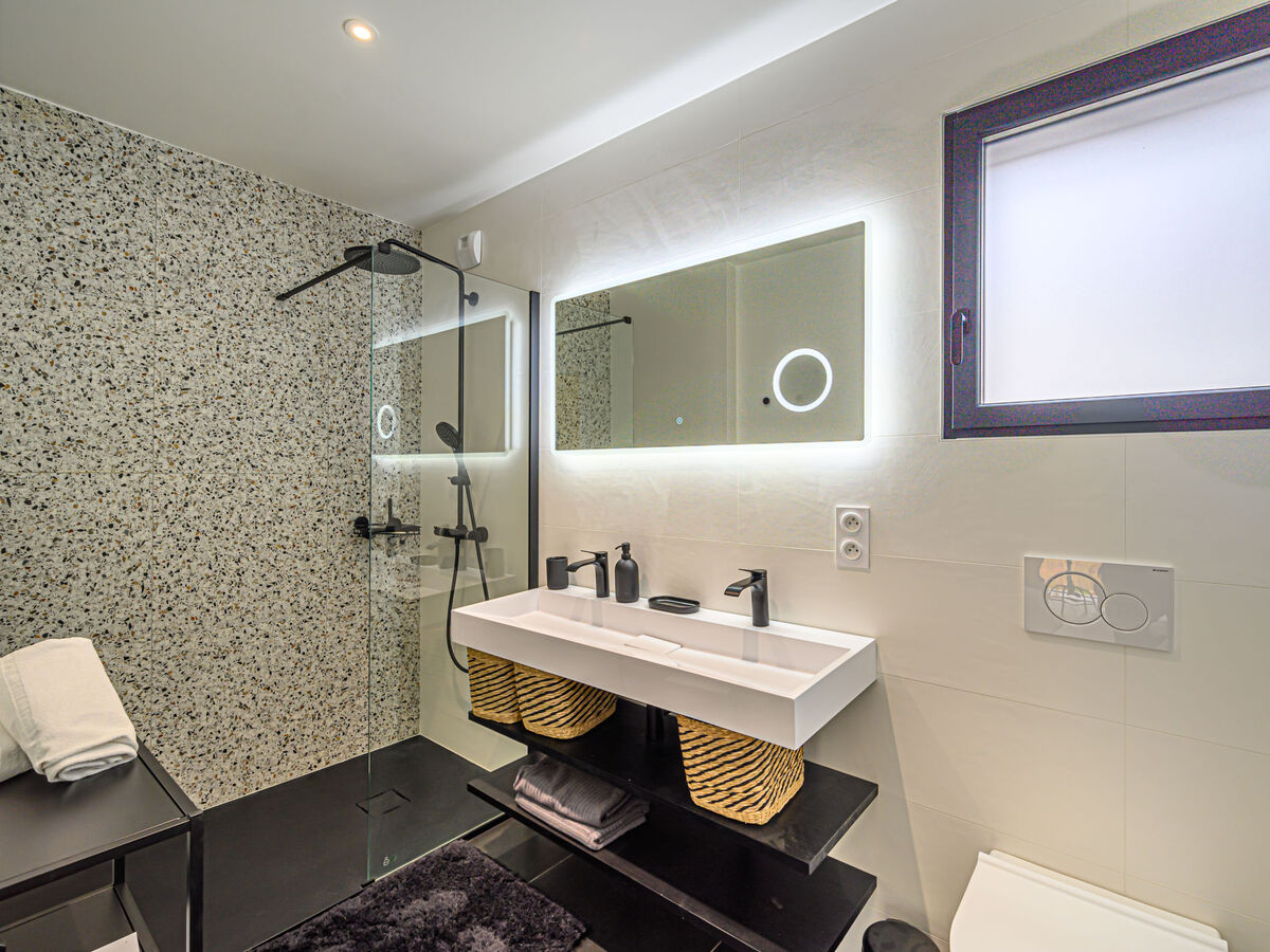 1 chambre avec 1 grand-lit (1 x 160 cm, longueur 200 cm), douche/WC, double vasque et TV (écran plat).