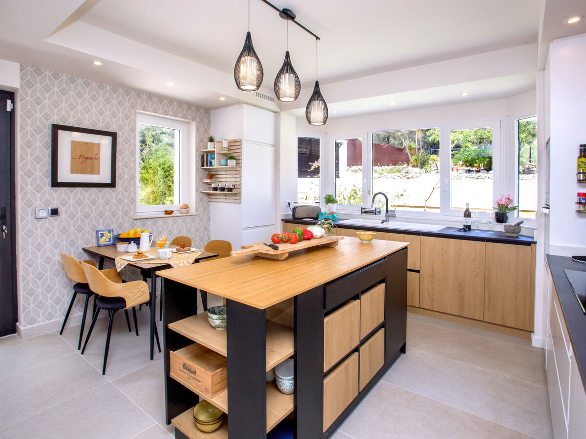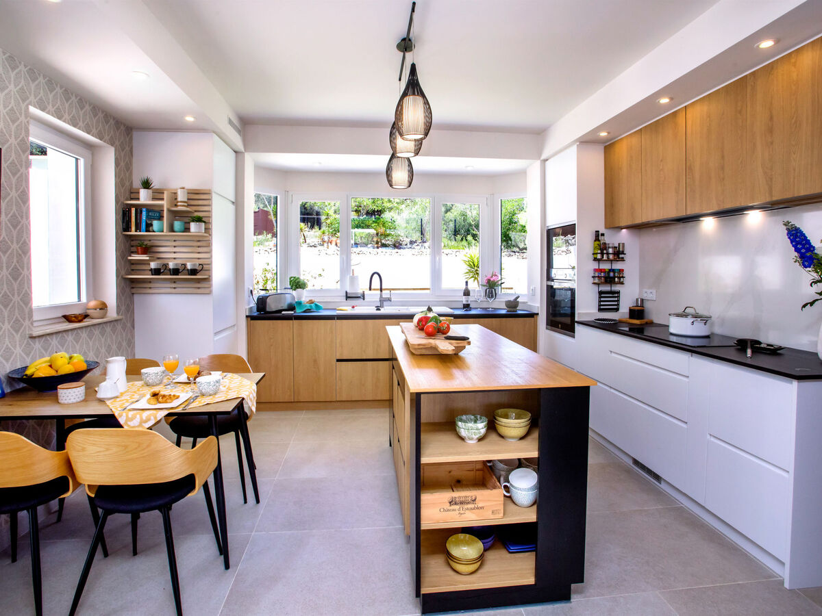 Grande cuisine ouverte (four, lave-vaisselle, 5 plaques vitrocéramiques, grille-pain, bouilloire électrique, micro-ondes, congélateur, cafetière électrique).