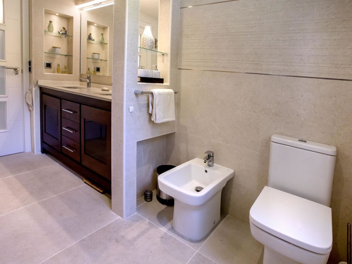 1 grande chambre 38 m2 avec 1 grand-lit (160 cm, longueur 200 cm), bain/douche/bidet/WC, double vasque, air-conditionné et chauffage à air chaud.
