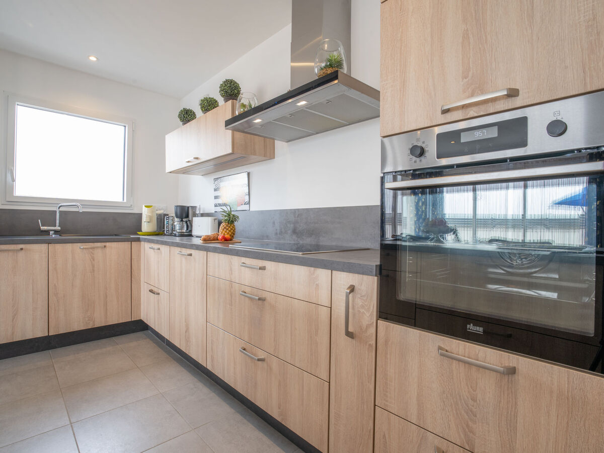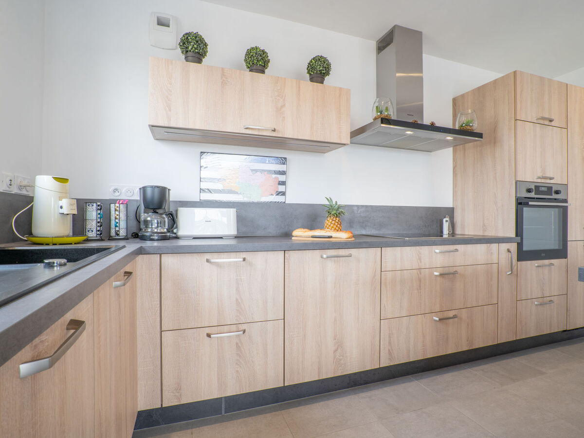 Cuisine ouverte (four, lave-vaisselle, 4 plaques à induction, grille-pain, bouilloire électrique, micro-ondes, congélateur, cafetière électrique, Capsules pour machine à café (Senseo) (NON INCLUSES)).