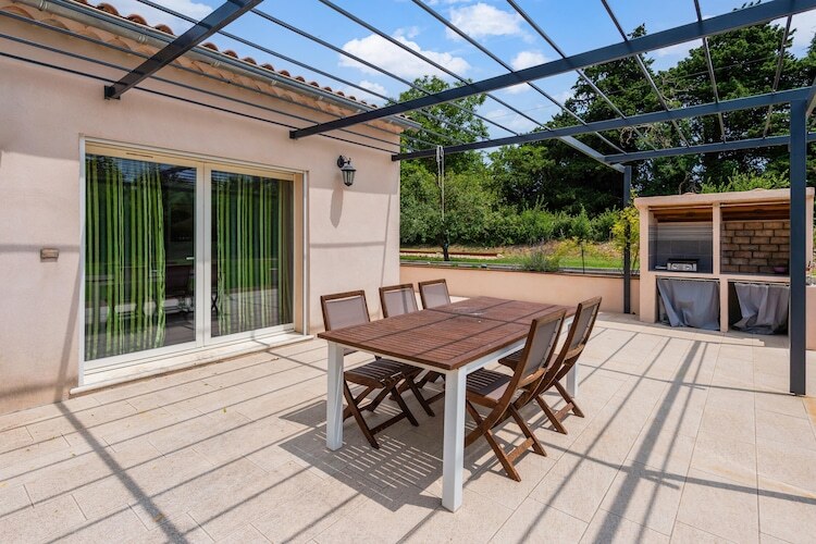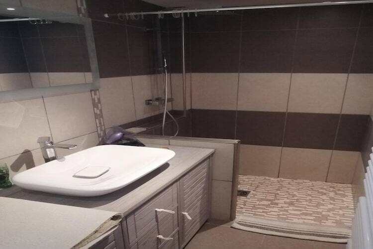 Rez-de-chaussée: (cuisine ouverte(cafetière/percolateur, four, micro ondes, lave-vaisselle , réfrigérateur), salle à manger-salon(TV, table, coin salon), chambre avec salle de bains(lit double, douche, lavabo), WC, climatisation) entre deux: (chambre(lit simple, lit simple), chambre(lit simple), salle de bains(baignoire où douche, lavabo, WC)) terrasse, terrasse(couverte), jardin, parking, plancha