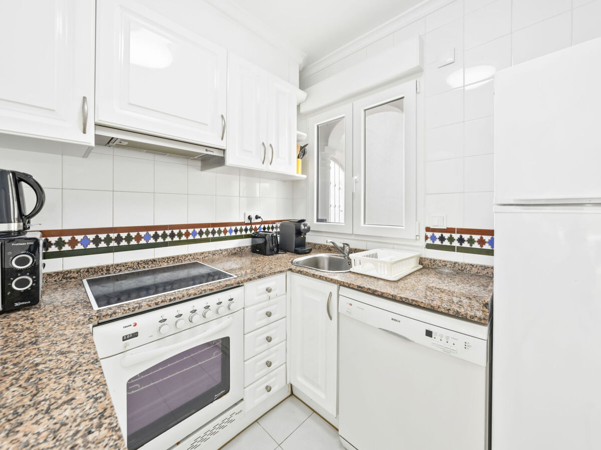 Cuisine ouverte (four, lave-vaisselle, 3 plaques vitrocéramiques, grille-pain, bouilloire électrique, micro-ondes, congélateur, cafetière électrique).