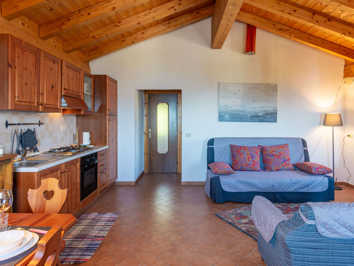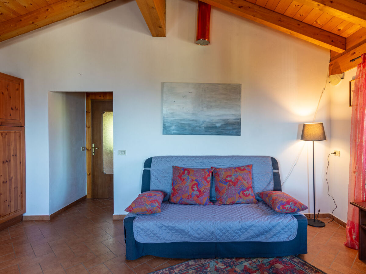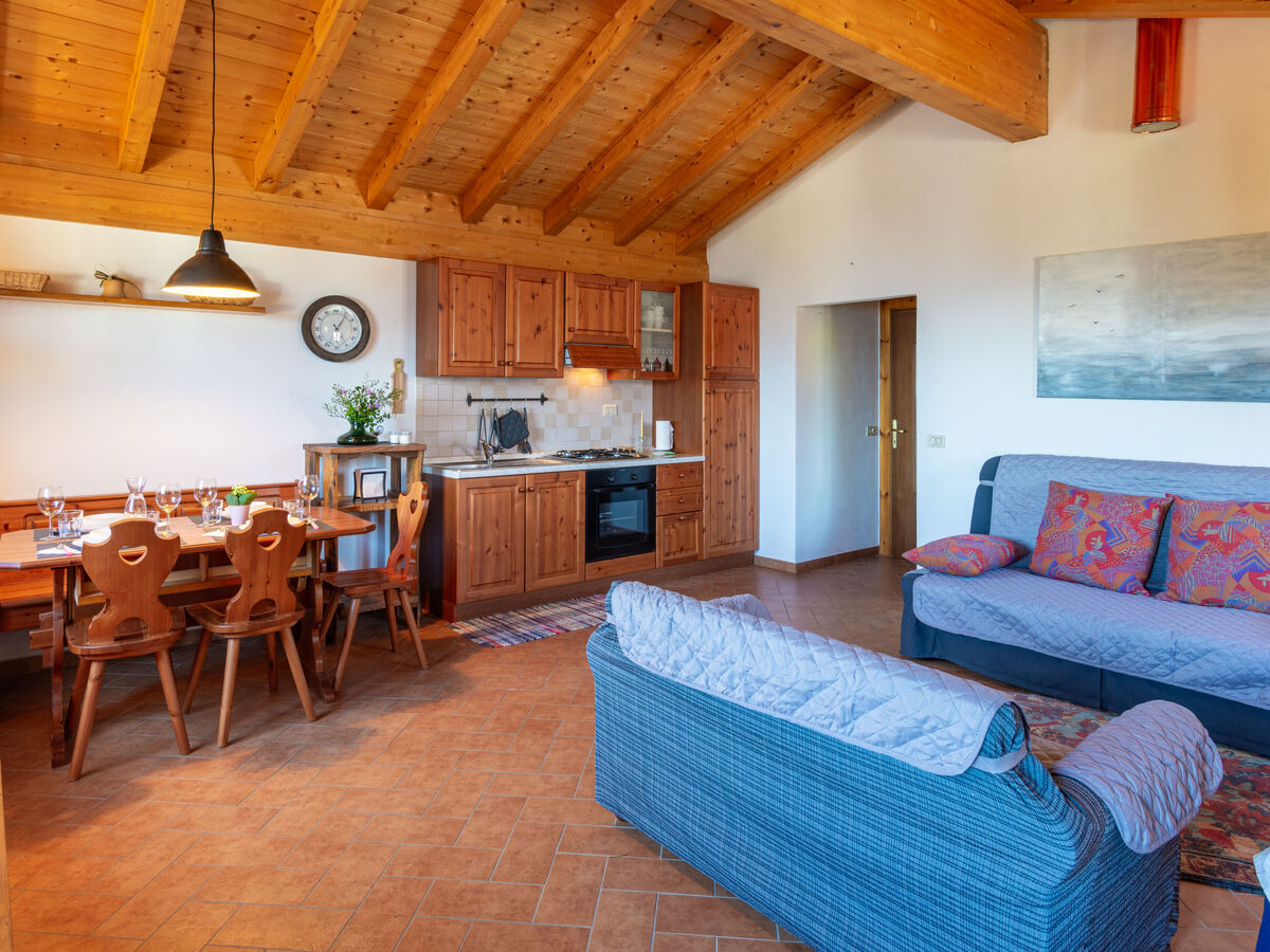 Partiellement rénovée en 2023, aménagement agréable et rustique: séjour/salle à manger avec 1 divan-lit double, coin repas et TV (écran plat).