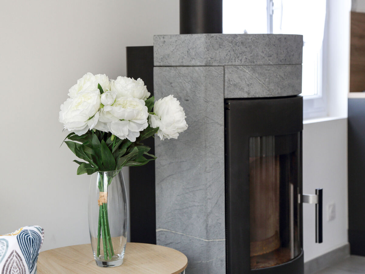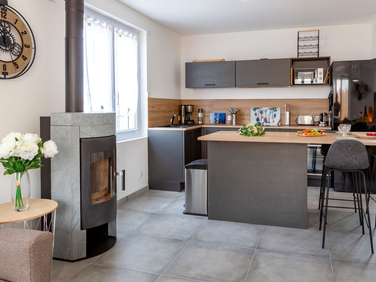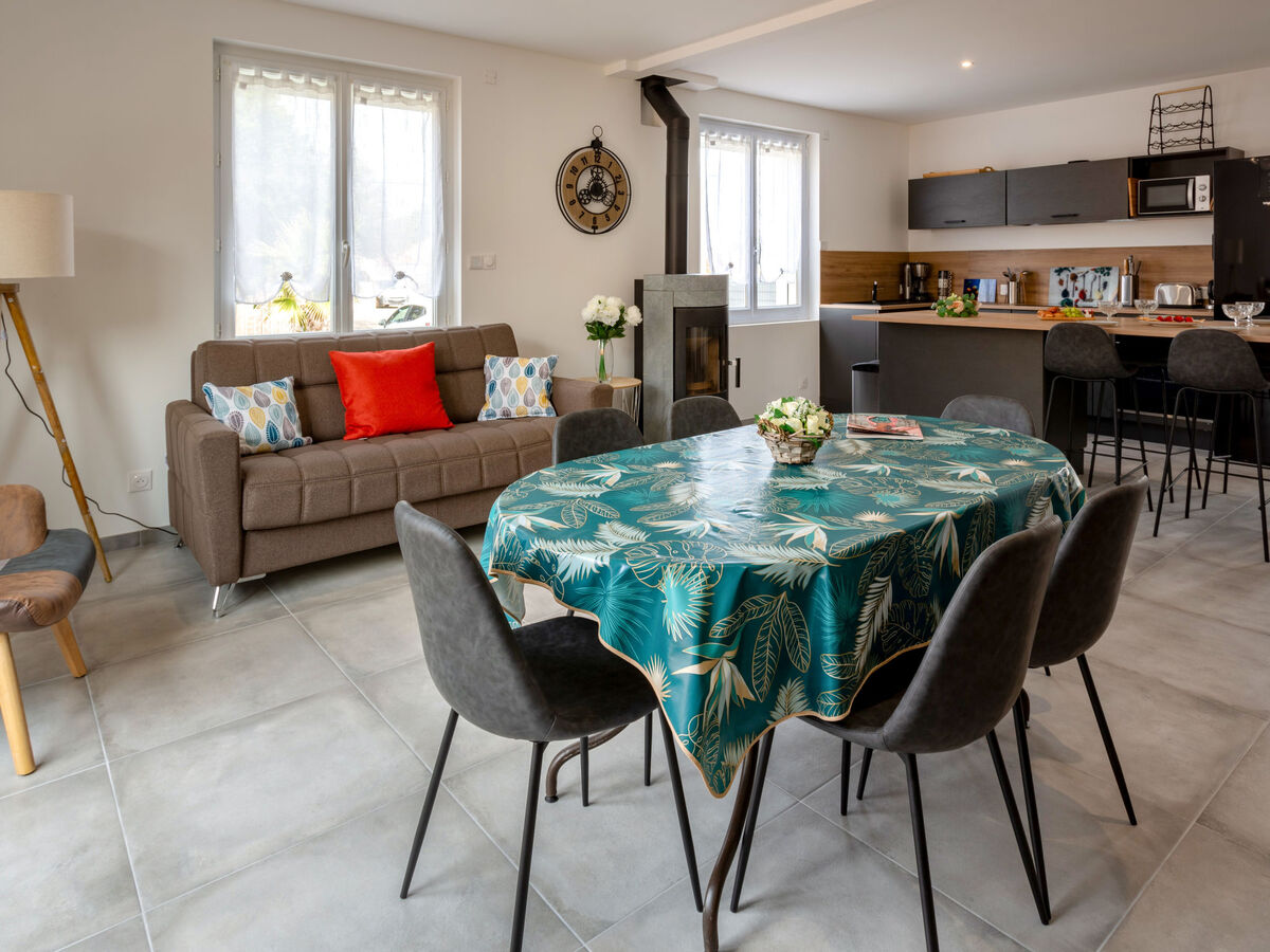 Aménagement moderne et plaisant: séjour/salle à manger avec TV (écran plat), poêle à bois.