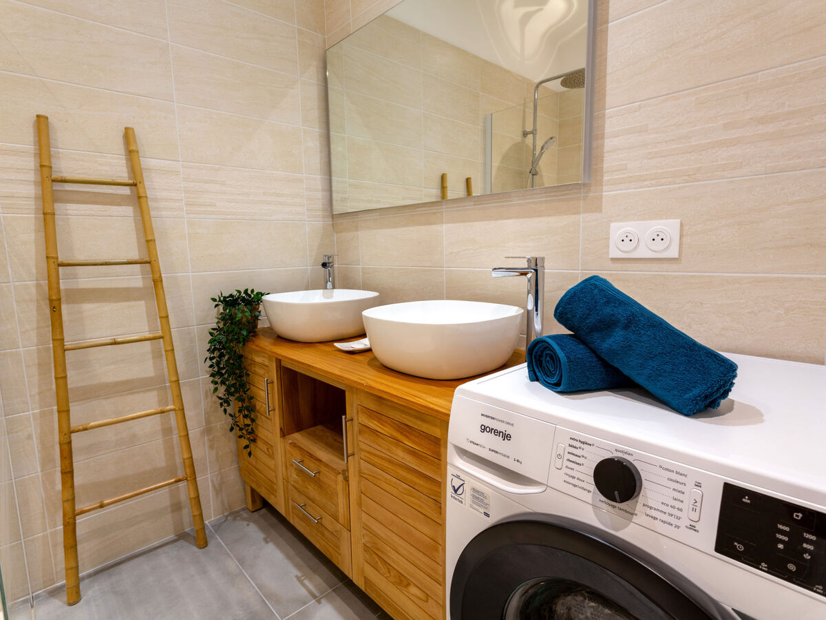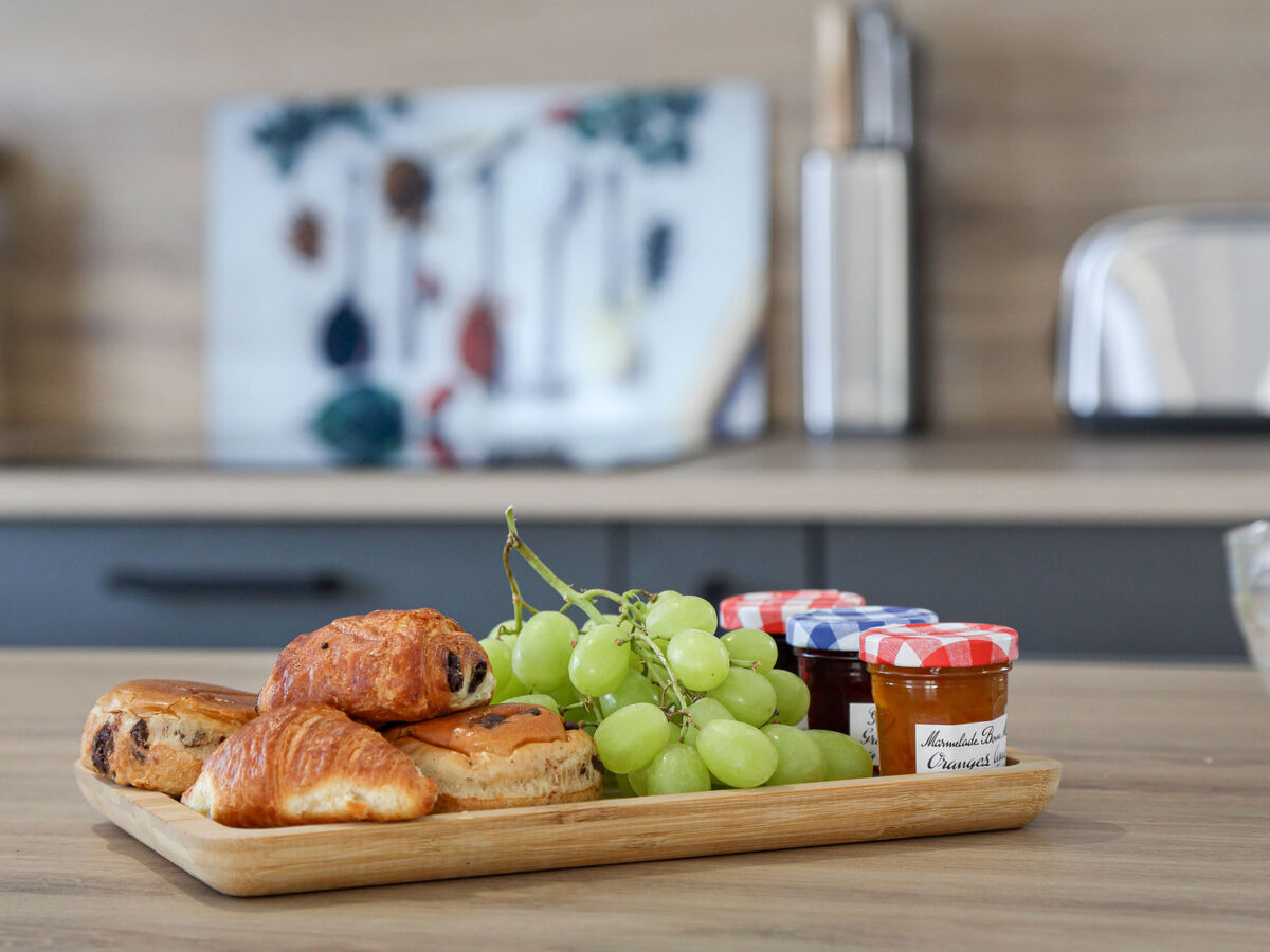 Cuisine ouverte (four, lave-vaisselle, 3 plaques à induction, grille-pain, bouilloire électrique, micro-ondes, congélateur, cafetière électrique).