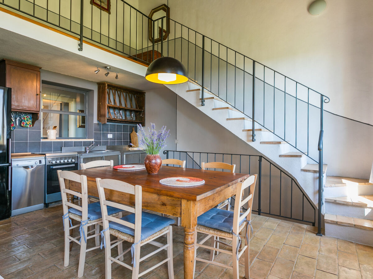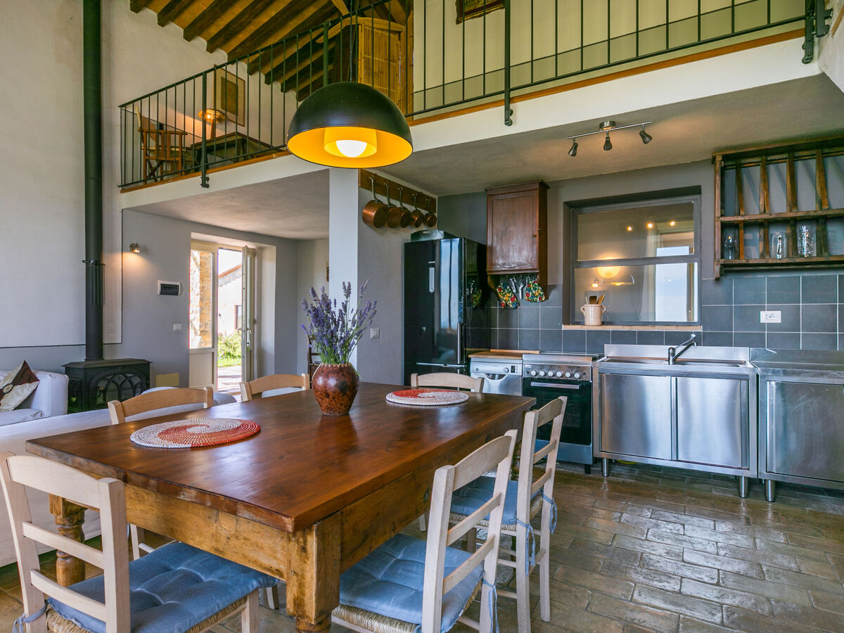 Cuisine ouverte (four, lave-vaisselle, 4 feux, bouilloire électrique) avec table pour les repas.