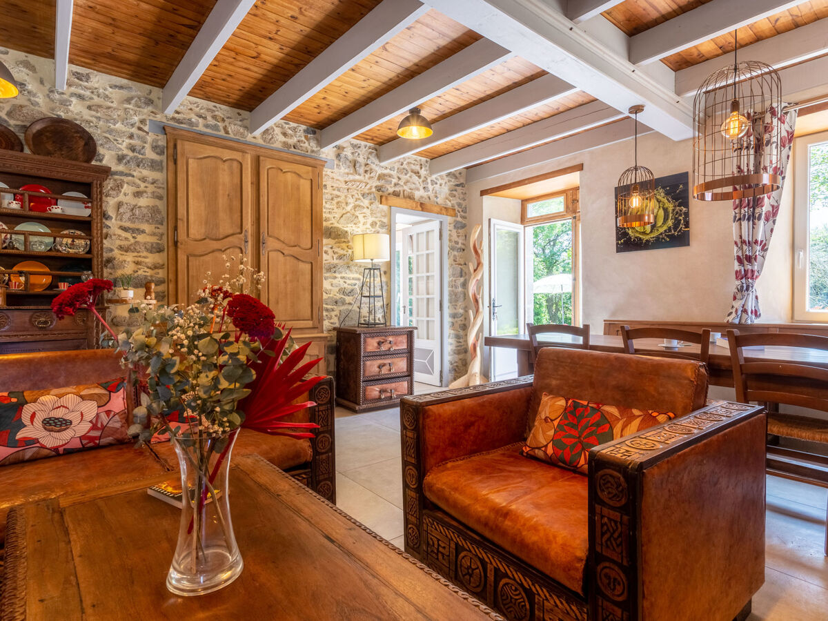 Maison traditionnelle en pierre de pays située au bout d’un village, dans un cadre boisé à l’Ouest et à proximité d’une zone d’activités : métallerie maison accueillante, confortable "Les Oiseaux", rénovée en 2023, environnée par les arbres.