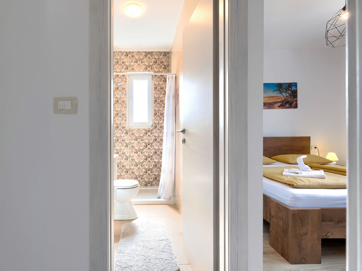 1 chambre avec 1 grand-lit (200 cm, longueur 200 cm), douche/WC et air-conditionné.