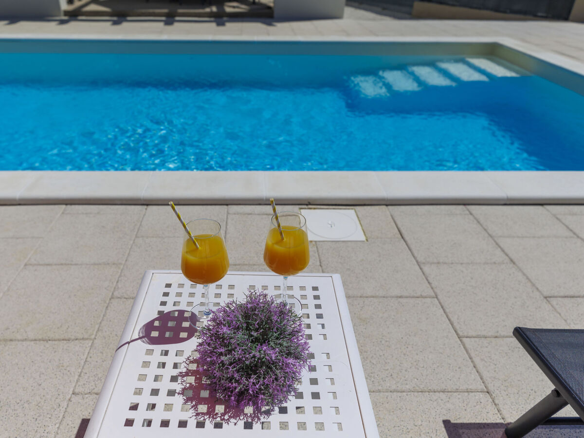A usage privé: terrain 500 m2, jardin avec pelouse et plantes, piscine rectangulaire (8 x 4 m, profondeur 140 cm, disponibilité saisonnière: 15.Avr.