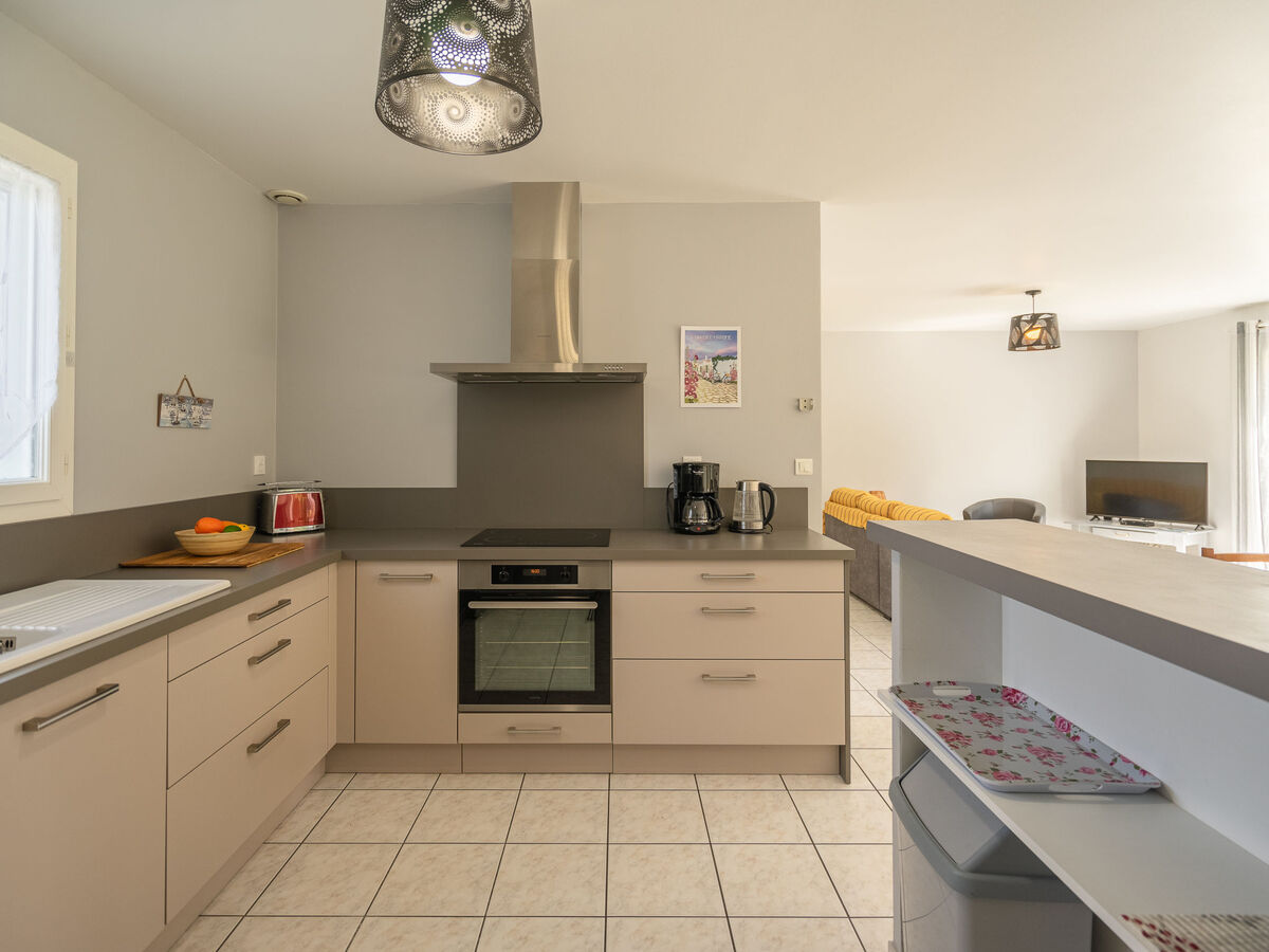 Cuisine ouverte (four, lave-vaisselle, 3 plaques vitrocéramiques, bouilloire électrique, micro-ondes, cafetière électrique).