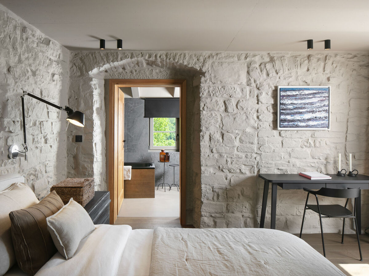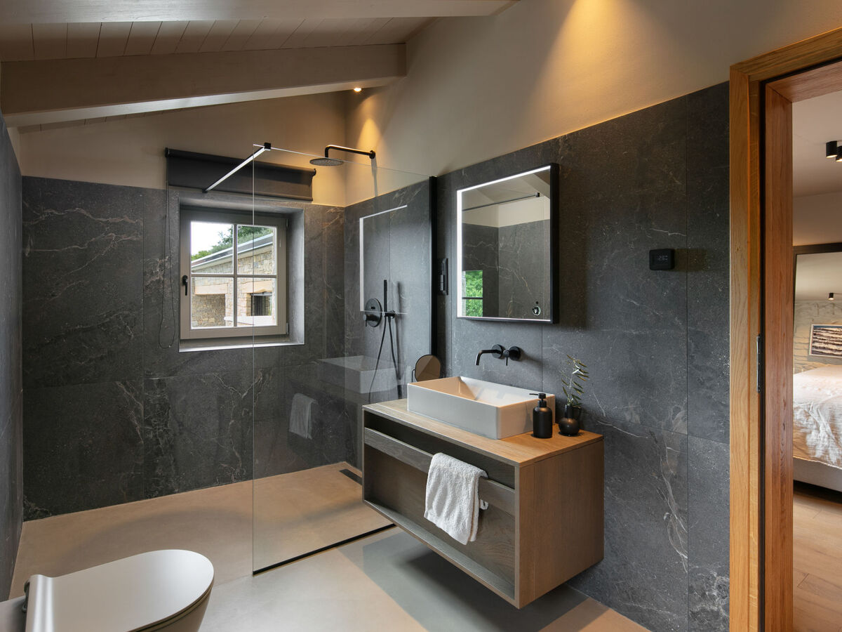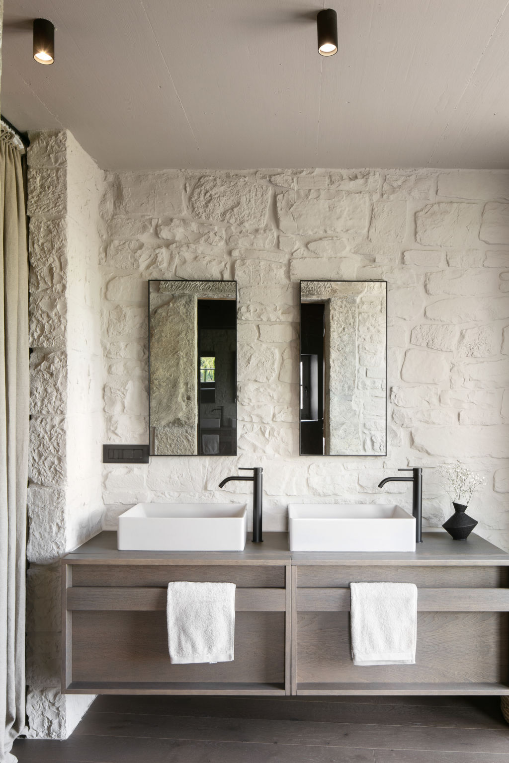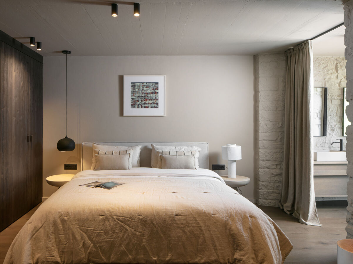 1 chambre avec 1 grand-lit (180 cm, longueur 200 cm), douche/WC, double vasque et TV (satellite).