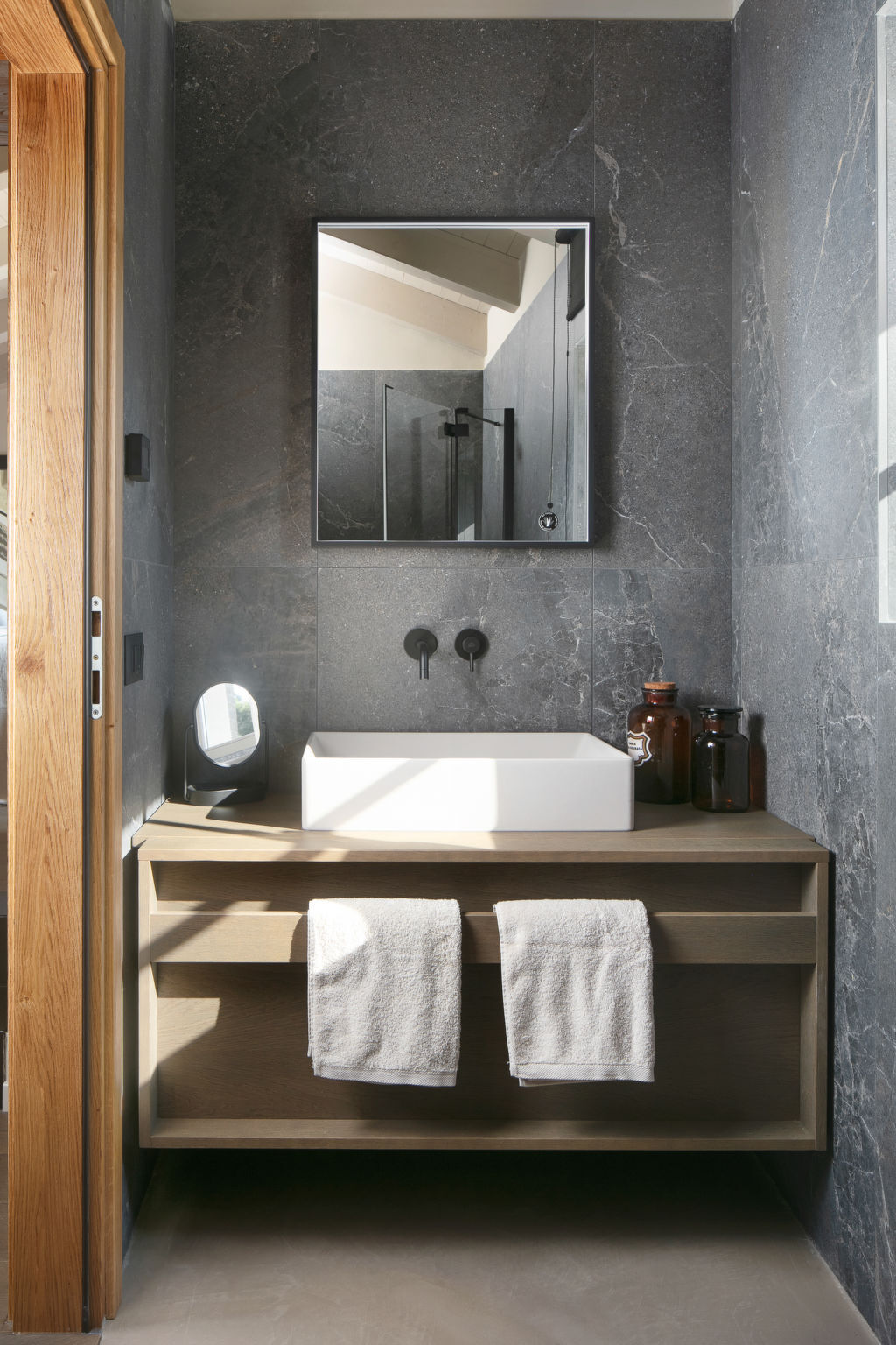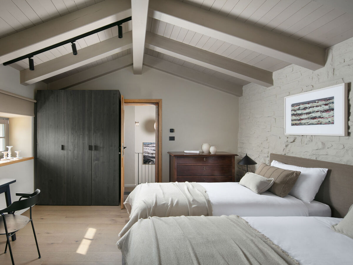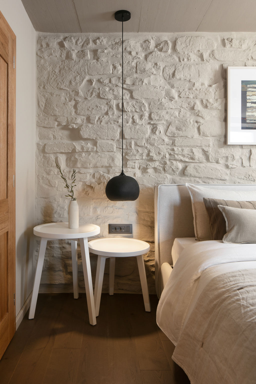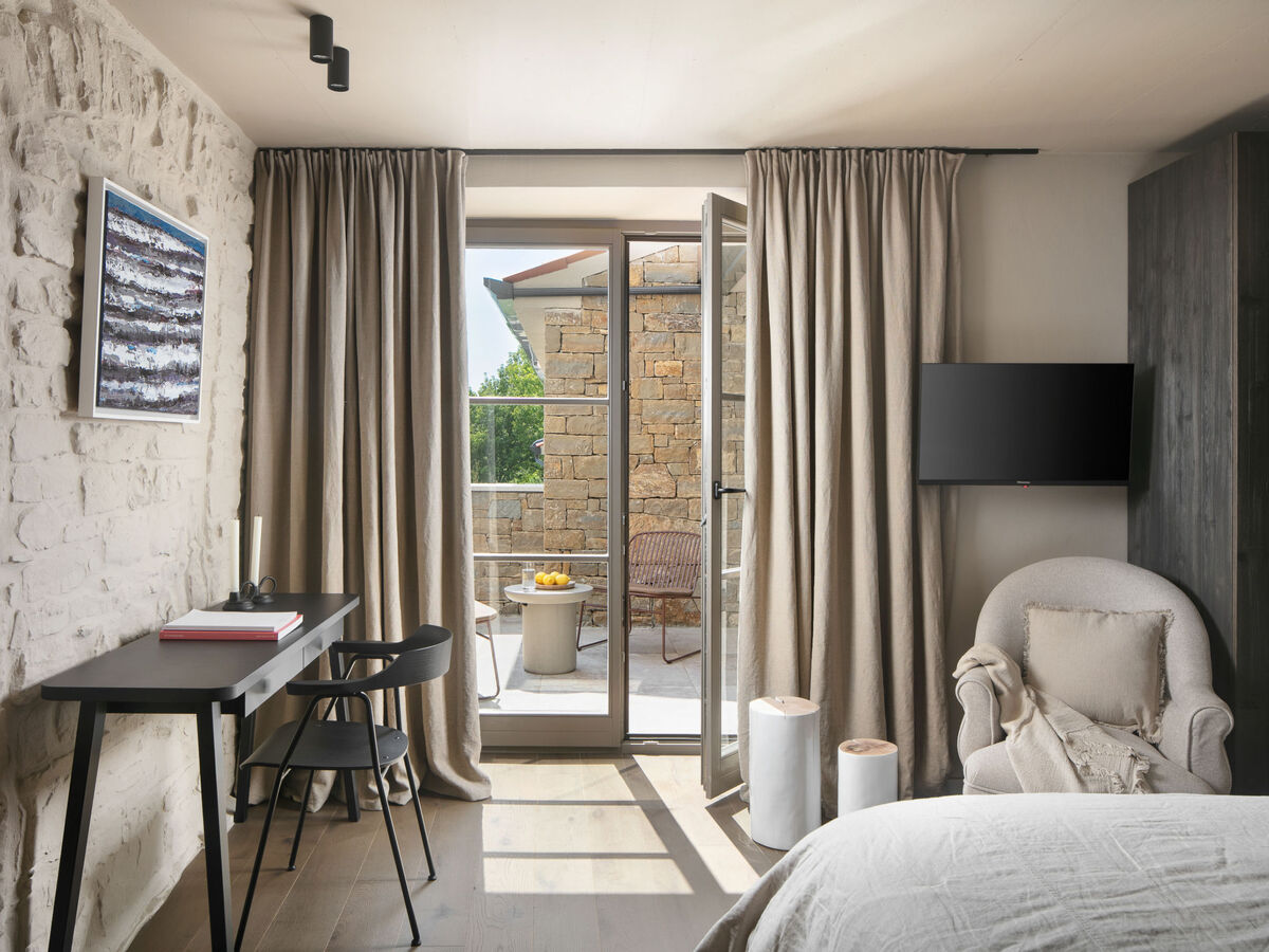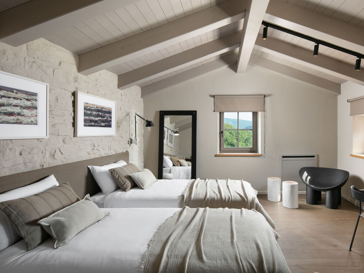 1 chambre avec 1 grand-lit (180 cm, longueur 200 cm), douche/WC, double vasque et TV (satellite).