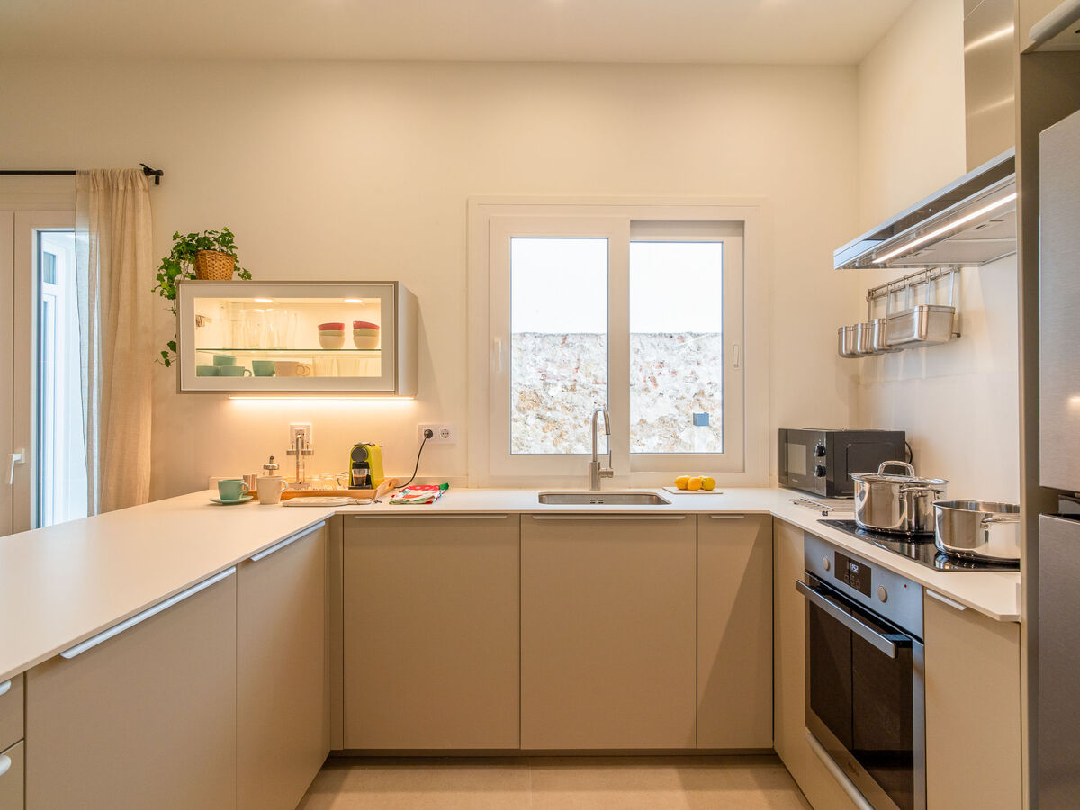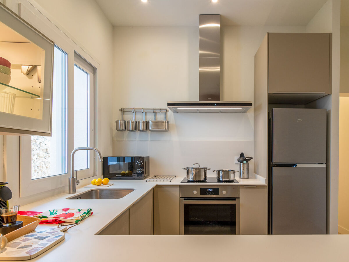 Cuisine ouverte (four, lave-vaisselle, 4 plaques à induction, grille-pain, bouilloire électrique, micro-ondes, cafetière électrique, Capsules pour machine à café (Nespresso) (NON INCLUSES)).