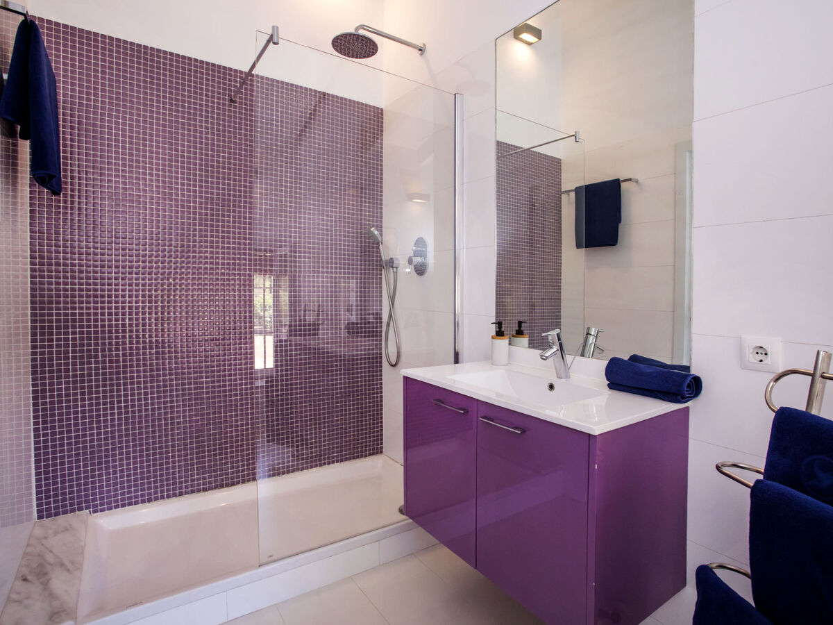 Douche extérieure, jardinet, pergola, meubles de jardin, place de parking sur le terrain.