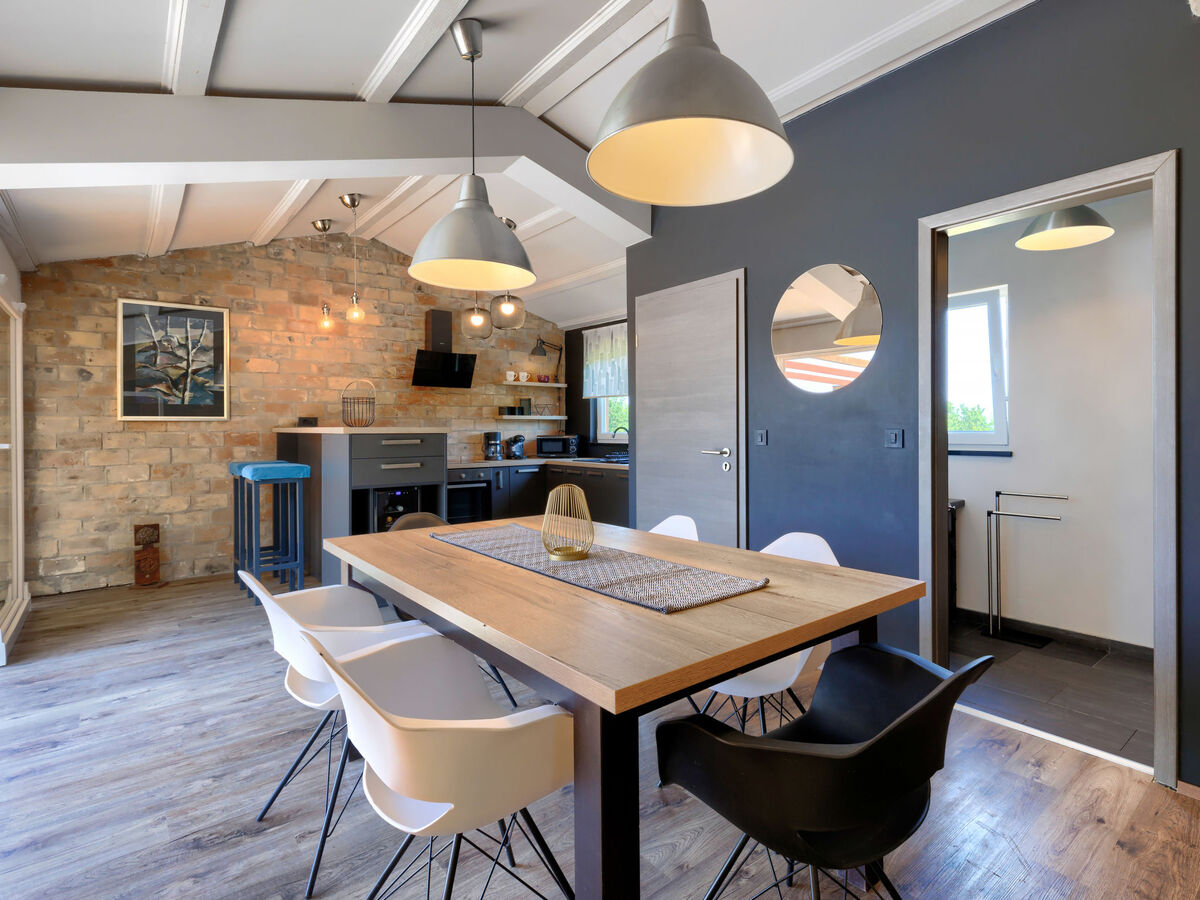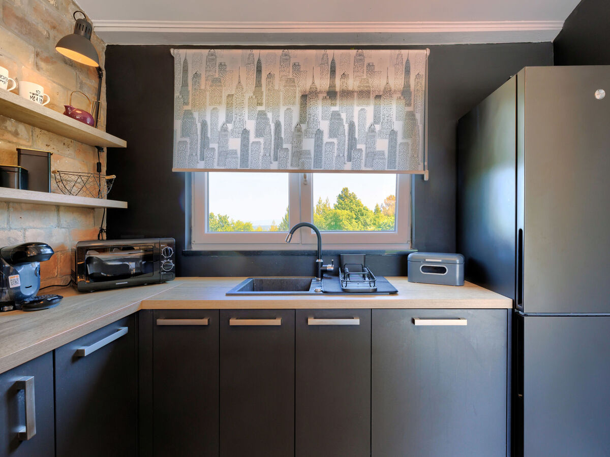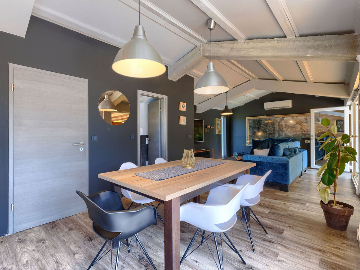 Cuisine ouverte (four, lave-vaisselle, 4 plaques vitrocéramiques, grille-pain, bouilloire électrique, micro-ondes, congélateur, cafetière électrique).