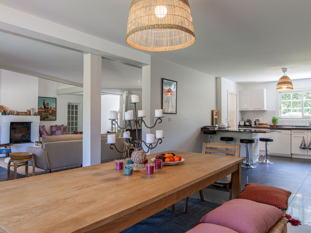 Spacieux et clair, aménagement confortable et agréable: grand séjour/salle à manger 70 m2 avec cheminée et table pour les repas.