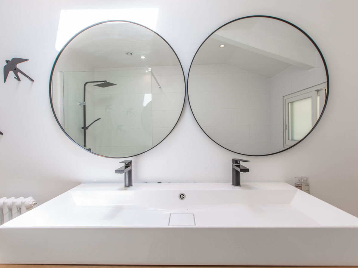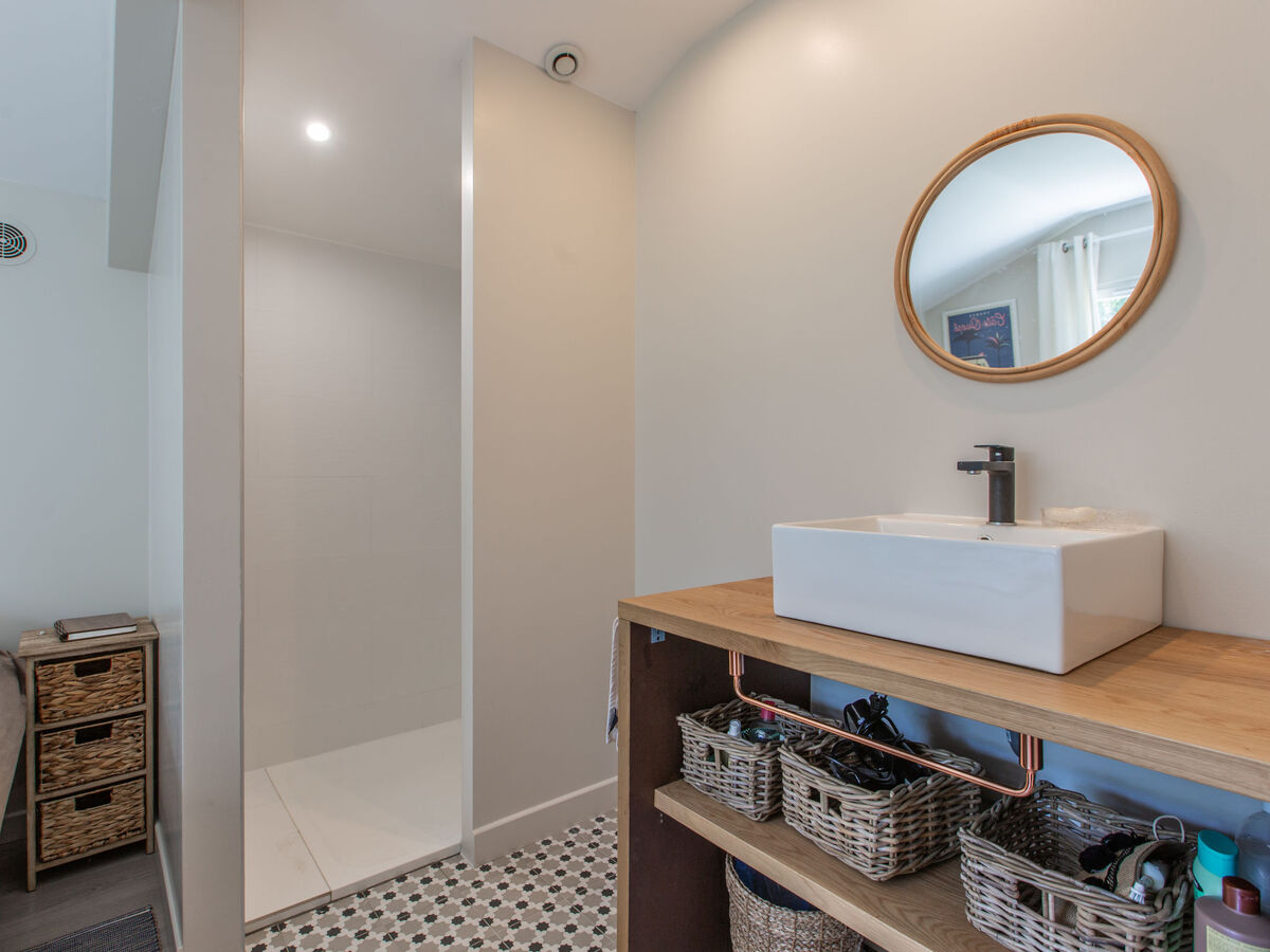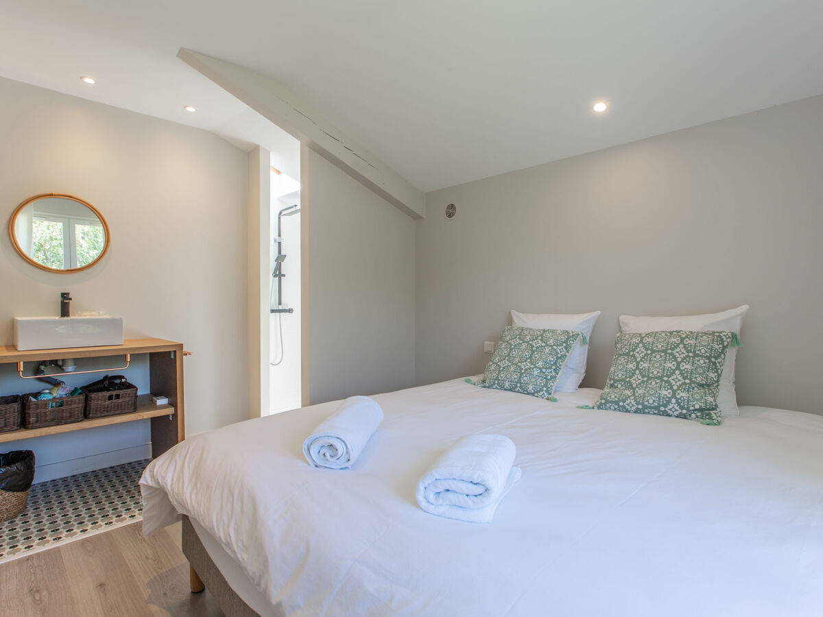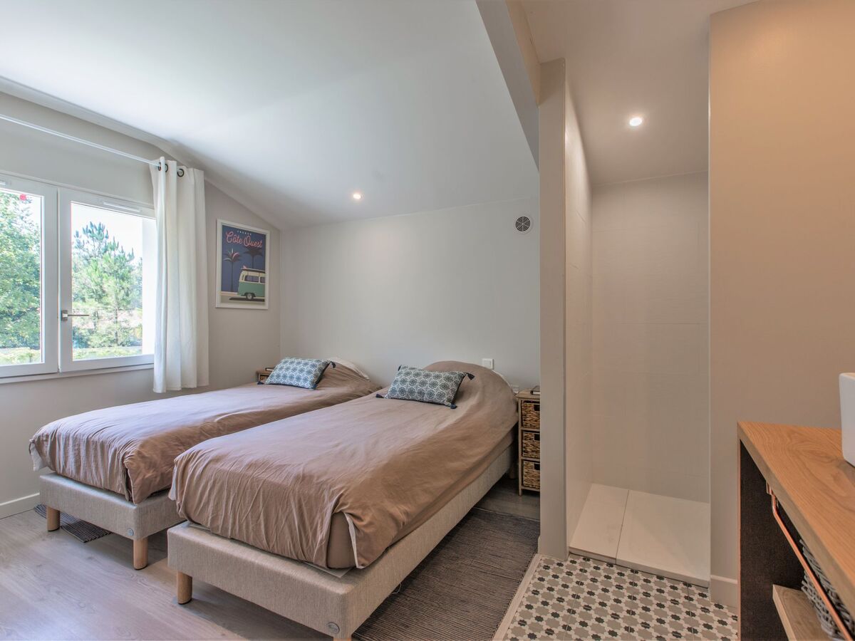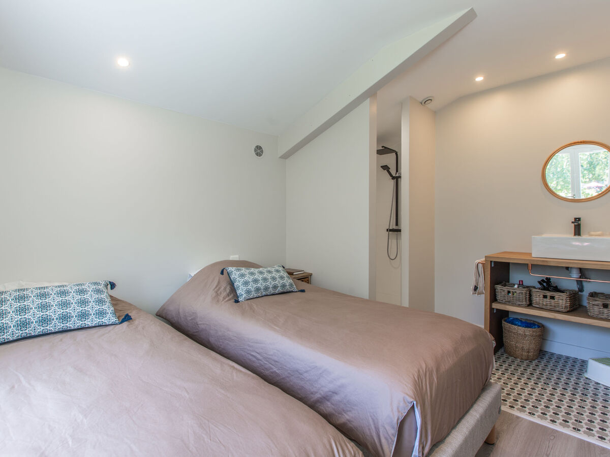 À l'étage supérieur: 2 chambres, chaque chambre avec: 2 lits (90 cm, longueur 200 cm), lavabo et douche.