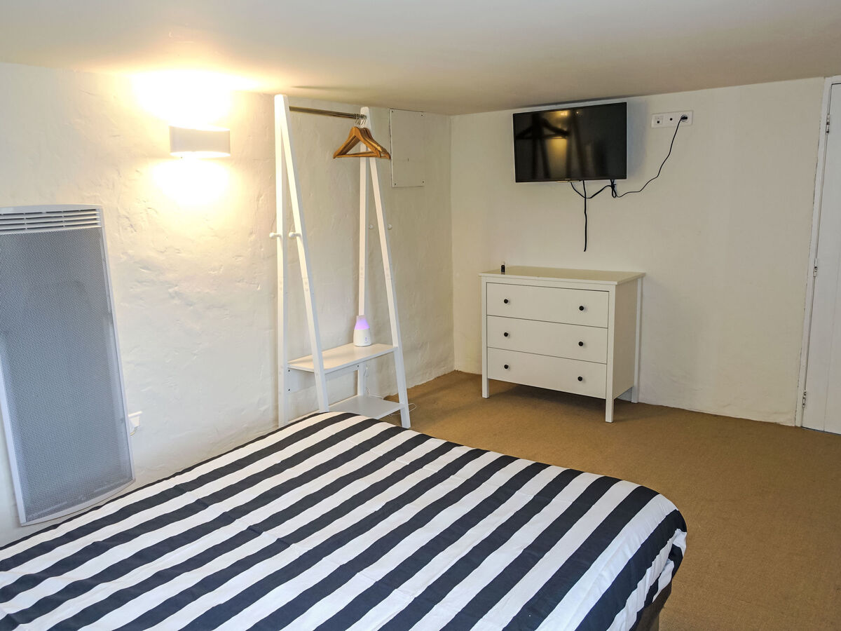 À l'étage inférieur: 1 chambre, hauteur plafond 185 cm avec 1 grand-lit (1 x 140 cm, longueur 190 cm), TV (écran plat).