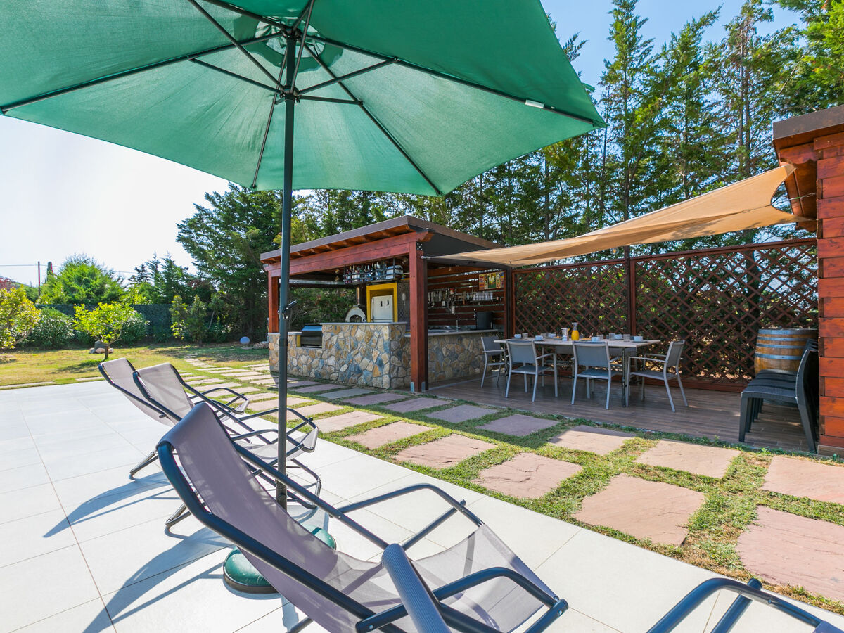 Meubles de terrasse, barbecue, chaises longues.
